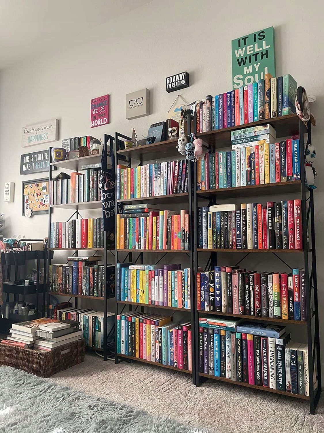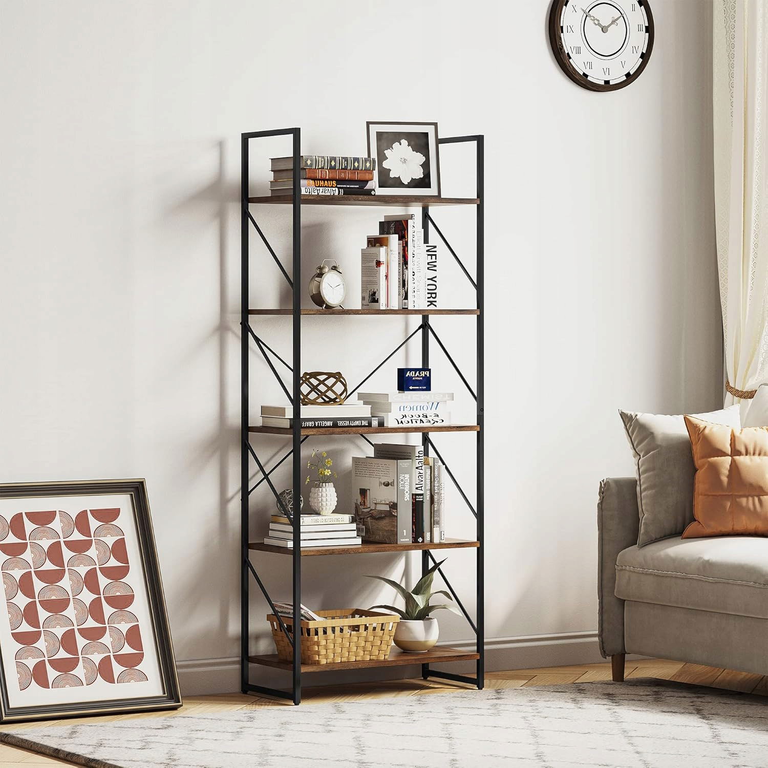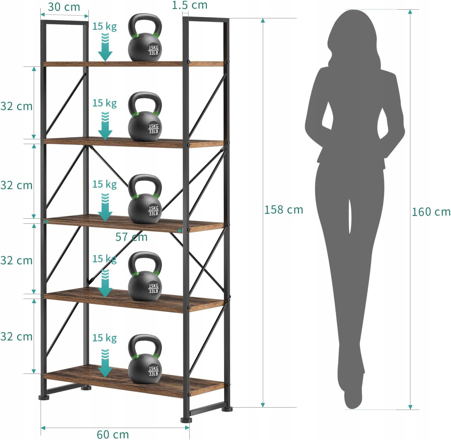 Nowoczesny regał industrialny z 5 otwartymi półkami to funkcjonalne i stylowe rozwiązanie do każdego wnętrza. Połączenie rustykalnego drewna i czarnej stalowej ramy nadaje mu elegancki, minimalistyczny charakter.