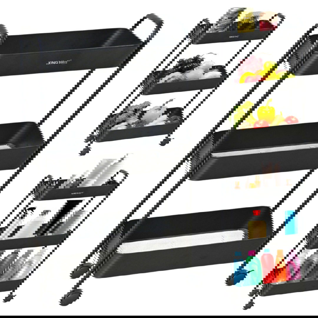 Elegancki, praktyczny i niezwykle funkcjonalny — trzypoziomowy regał mobilny KINGHoff to doskonałe rozwiązanie do kuchni, łazienki, salonu lub biura. Dzięki solidnej stalowej konstrukcji i nowoczesnemu czarnemu wykończeniu idealnie wpasuje się w każde wnętrze, zapewniając wygodne miejsce do przechowywania i łatwy dostęp do niezbędnych przedmiotów.