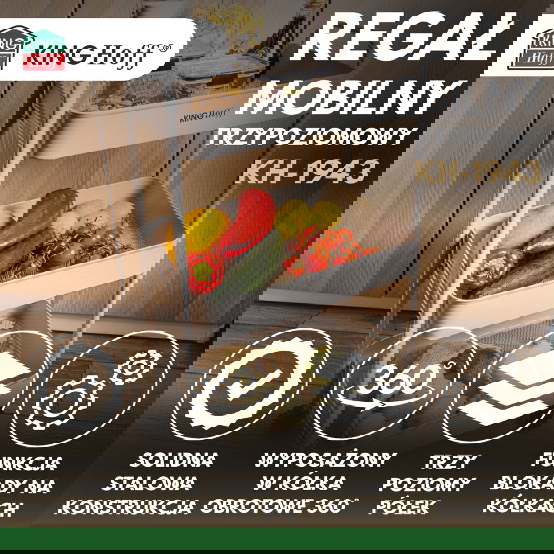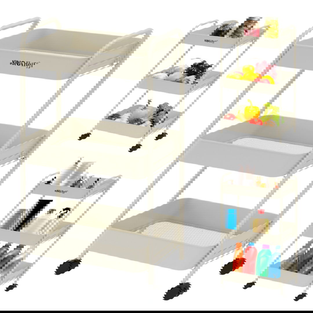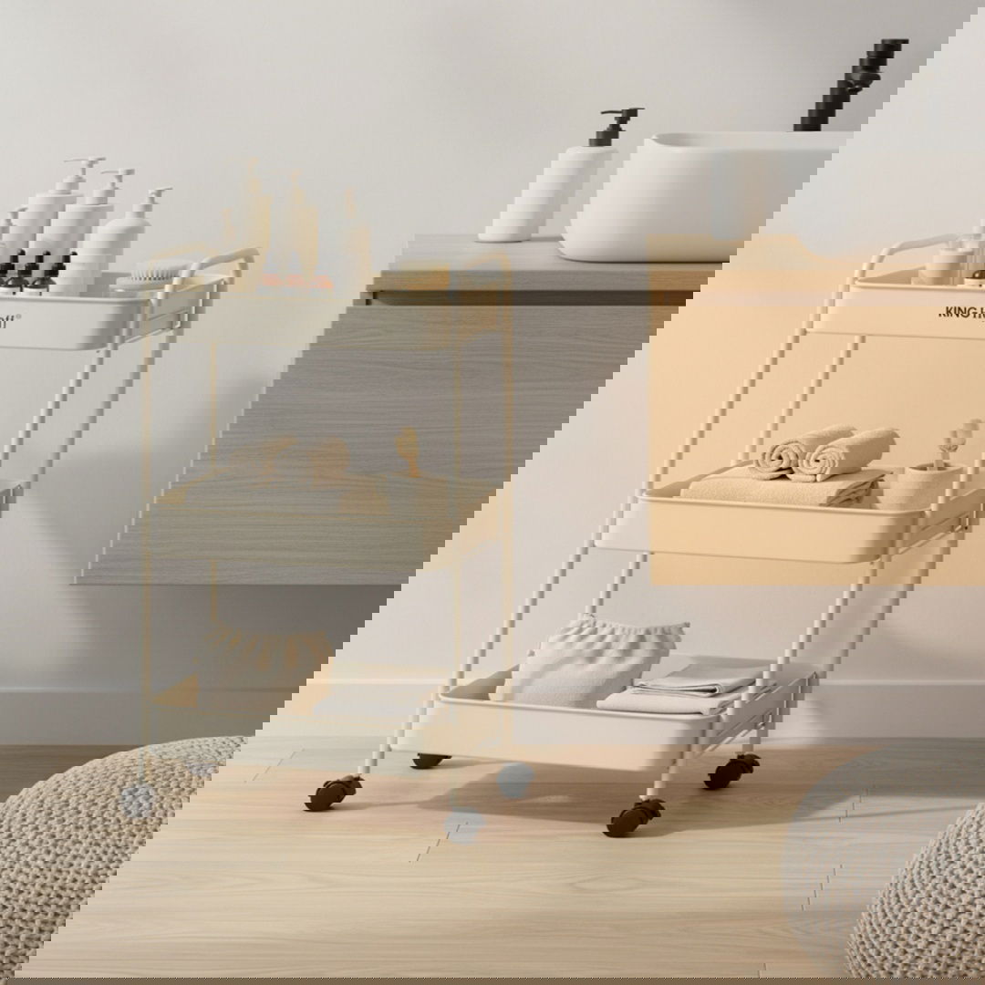 Praktyczny i elegancki — trzypoziomowy regał mobilny KINGHoff w kolorze beżowym to stylowe rozwiązanie do organizacji przestrzeni w kuchni, łazience, salonie lub biurze. Subtelny, ciepły odcień beżu doskonale komponuje się z różnymi aranżacjami wnętrz, dodając im przytulności i estetycznego wyrazu.