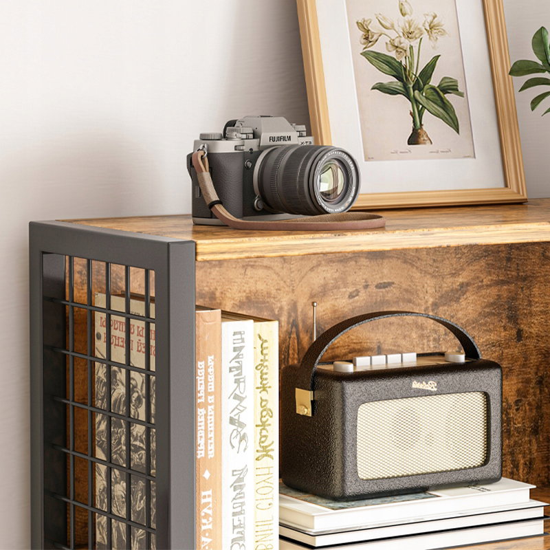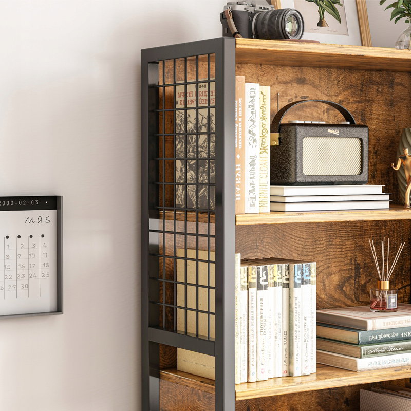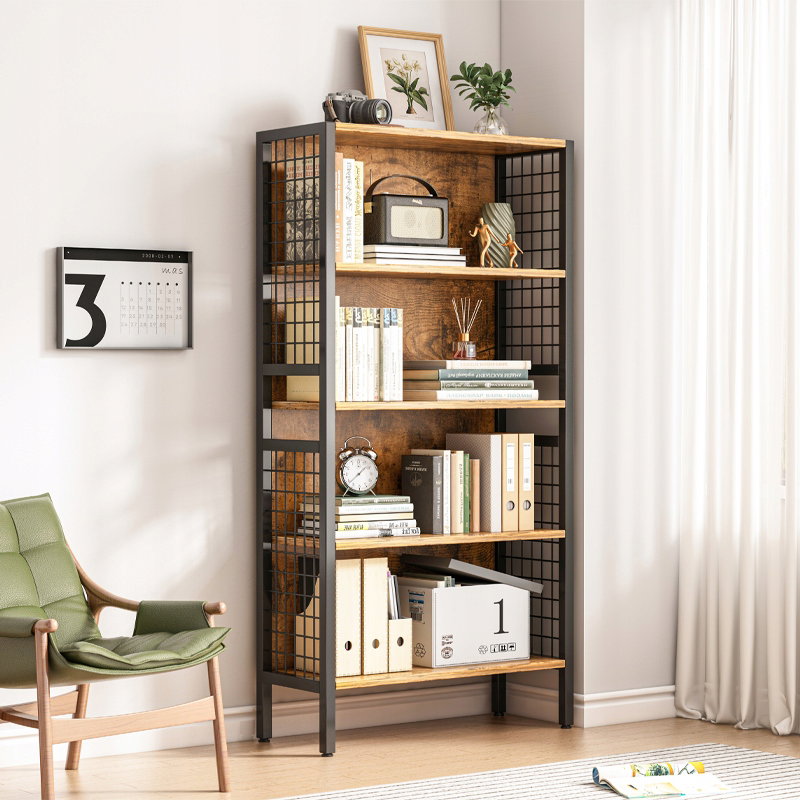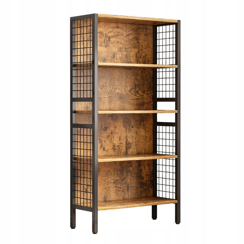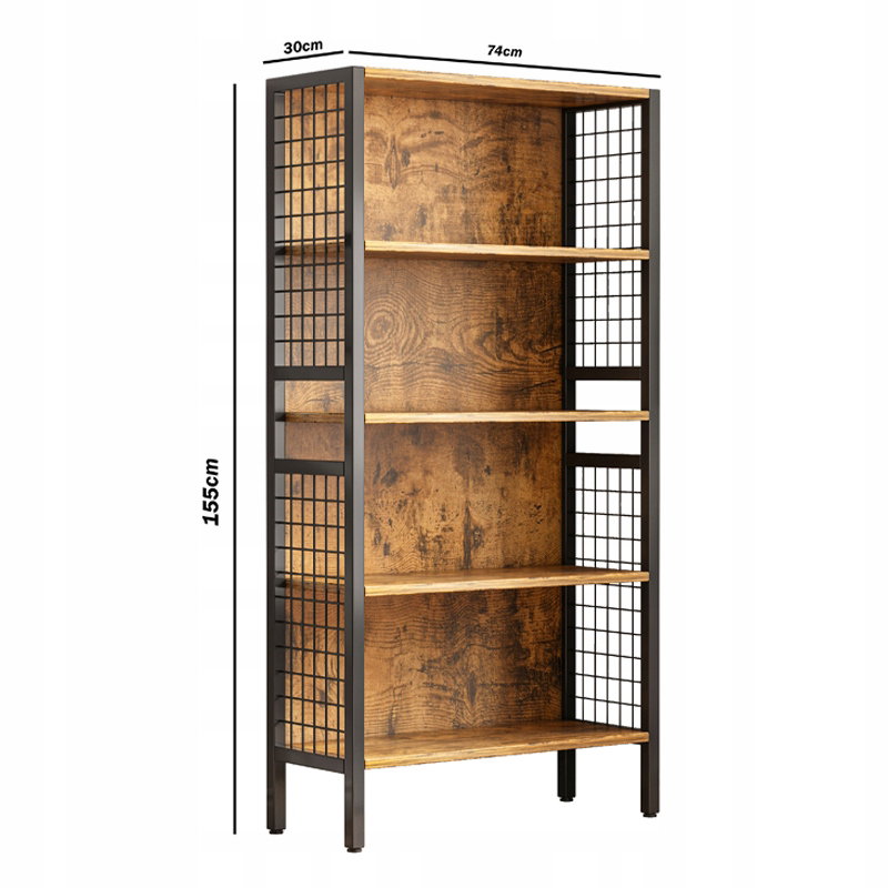 Regał zachwyca ciepłym odcieniem postarzanego drewna (wykonanego z trwałej płyty MDF), który doskonale kontrastuje z matową, czarną metalową ramą. Siatkowe boczne elementy dodają mu surowego, industrialnego charakteru i jednocześnie zapewniają stabilność konstrukcji.
