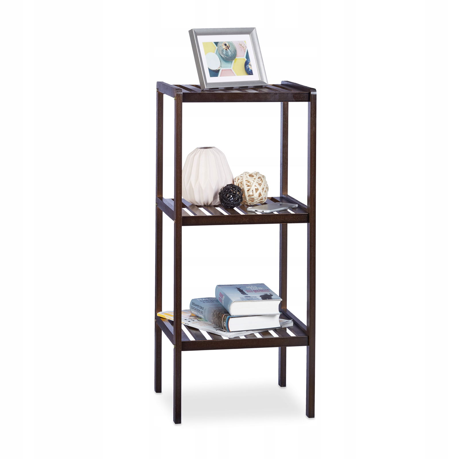 Ten elegancki regał stojący, wykonany z trwałego bambusa o ciemnobrązowym, kasztanowym wykończeniu, to idealne rozwiązanie do organizacji łazienki, kuchni, przedpokoju czy nawet pokoju dziecięcego. Dzięki trzem przestronnym półkom, zapewnia wygodne miejsce do przechowywania ręczników, kosmetyków, książek, butów i innych akcesoriów.