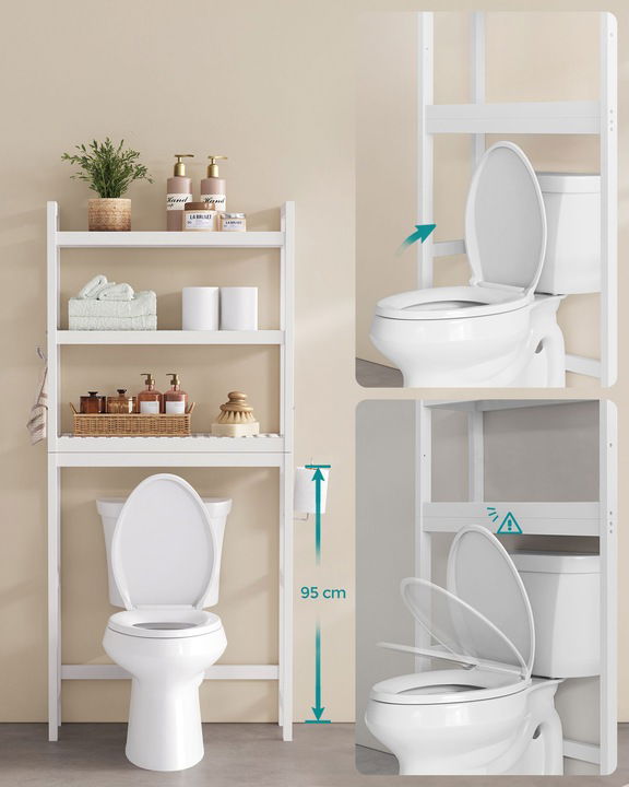 Innowacyjne rozwiązanie z trzema poziomami praktycznego organizera łazienkowego nad toaletę pozwalają uporządkować przestrzeń bez zajmowania miejsca na podłodze. Dzięki regulowanej środkowej półce możliwe jest dopasowanie wysokości do indywidualnych potrzeb, np. na szampony, ręczniki lub ozdobne rośliny, a boczne drążkii zapobiegają spadaniu rzeczy. Organizer wyposażono w 4 haczyki oraz uchwyt na papier toaletowy, ułatwia codzienne użytkowanie i zapewnia szybki dostęp do niezbędnych przedmiotów. Wykonanie z naturalnego, odnawialnego bambusa gwarantuje wysoką trwałość i wygląd w duchu eko. Naturalna faktura drewna dodaje wnętrzu harmonii i elegancji, jednocześnie wprowadzając przytulną atmosferę. Organizer pasuje do większości toalet, a regulacja dolnego drążka (9,5 cm lub 16,5 cm od podłogi) umożliwia idealne dopasowanie do różnych modeli. Zaleca się pozostawienie ok.1 cm przestrzeni po obu stronach i nad nią, aby uniknąć zarysowań. Sprawdzi się również nad pralką czy koszem na śmieci.