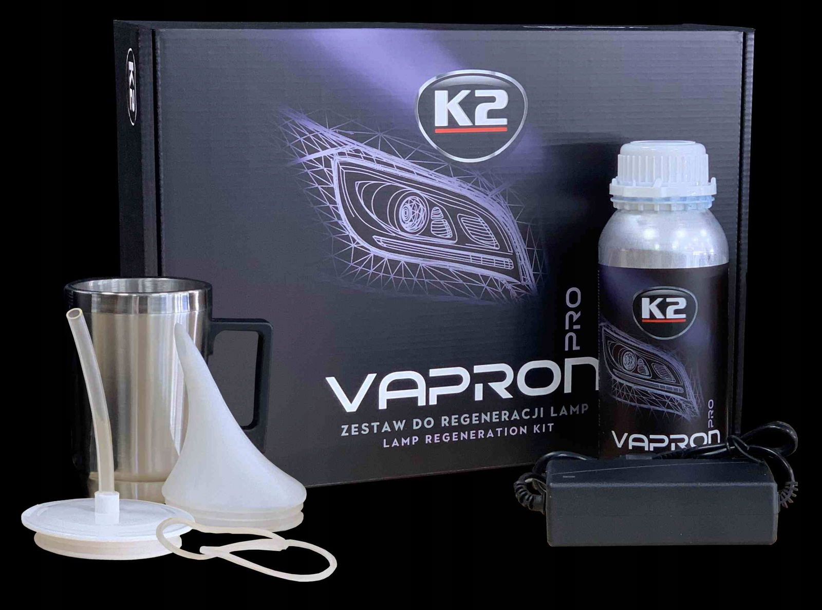 K2 Vapron to profesjonalny zestaw do regeneracji i zabezpieczenia zniszczonych lamp, popularnie nazywany „czajniczkiem do reflektorów” lub „magicznym czajniczkiem”. Doskonale nadaje się do odnawiania zniszczonych (zmatowiałych, pożółkłych) reflektorów, niezależnie od wieku samochodu i stopnia zniszczenia lamp.