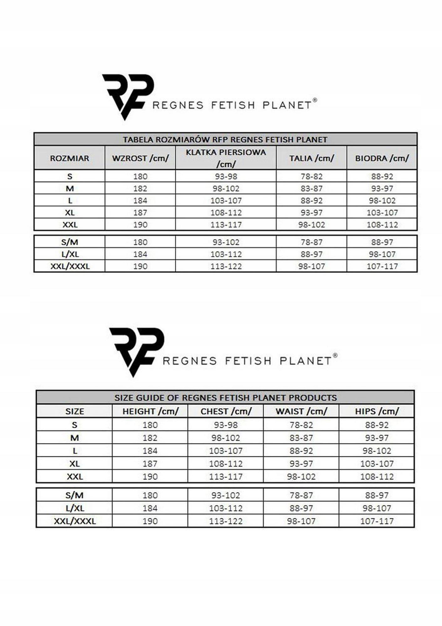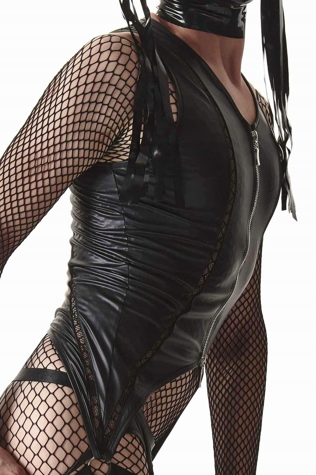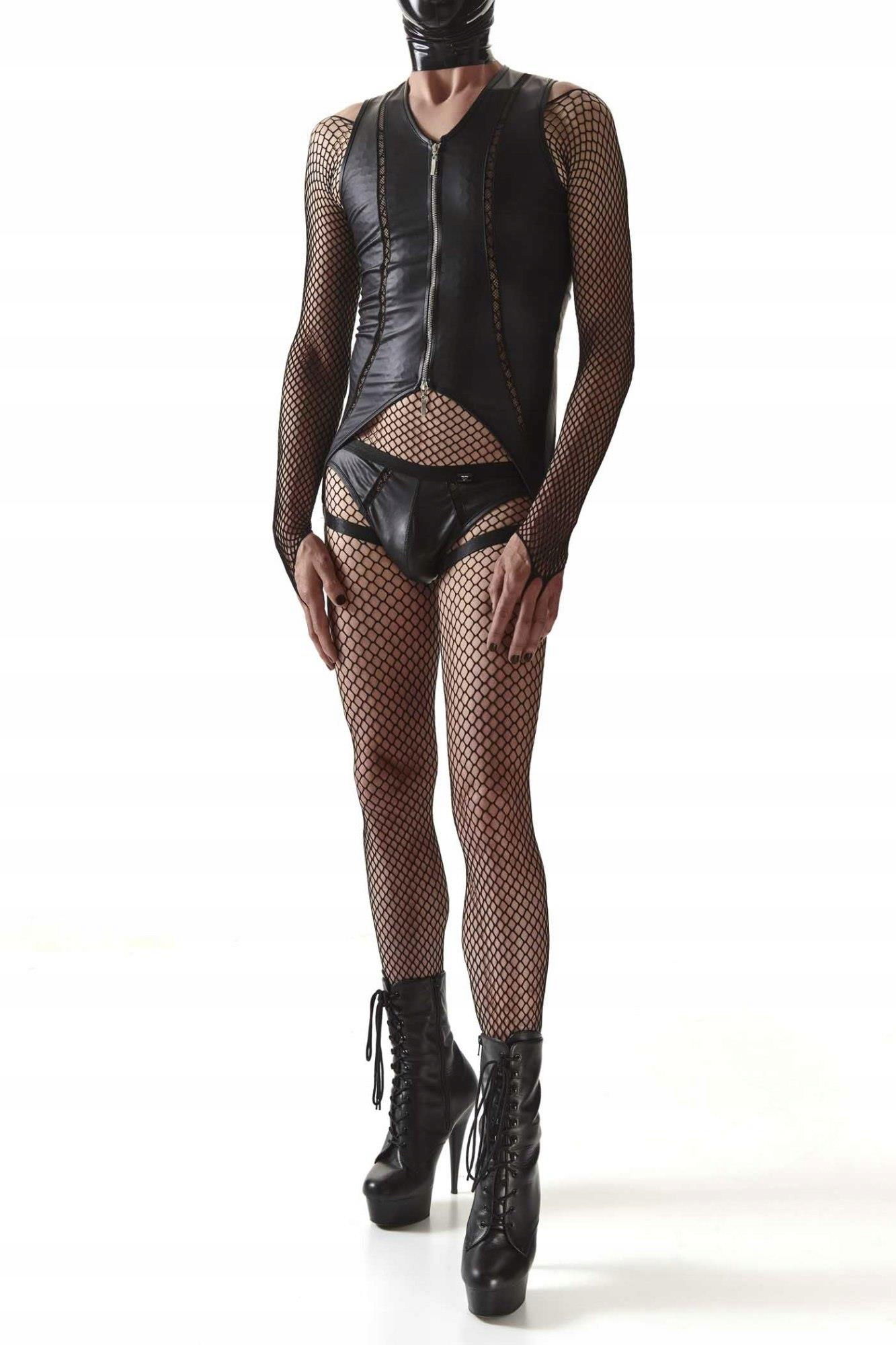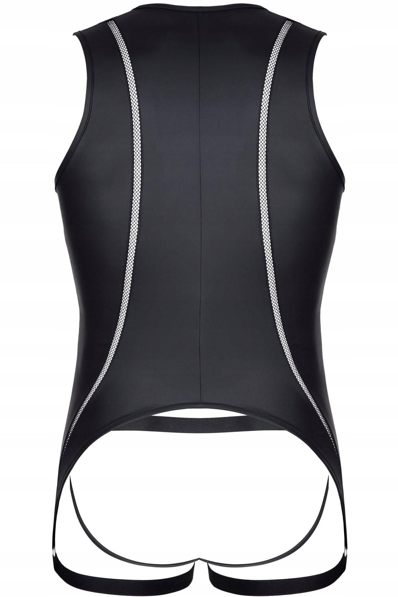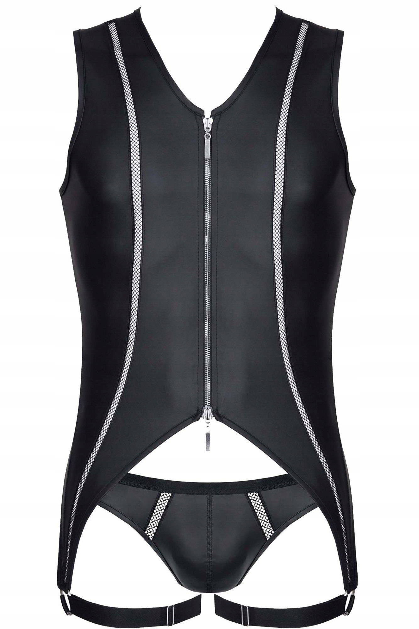 Body: Efektowne z czarnego wetlooka. Z przodu po bokach pionowe elementy dekoracyjne z czarnej siateczki. Ekspres z przodu zapinany dwustronne z ozdobnymi suwakami. Body po bokach, u dołu kończy się poniżej linii pośladków paskami z czarnej, miłej w dotyku gumki z metalowymi regulatorami. Z tyłu kolisty kształt apetycznie i zmysłowo ukazuje nagie pośladki. Majtki typu jockstrap. Z przodu ozdobne siateczki po bokach. Na obwodzie bardzo miła, czarna gumka z metalicznym połyskiem. Dolne paski body, będące na udach oraz tylne paski od majtek efektownie podkreślają kształt nagich pośladków.