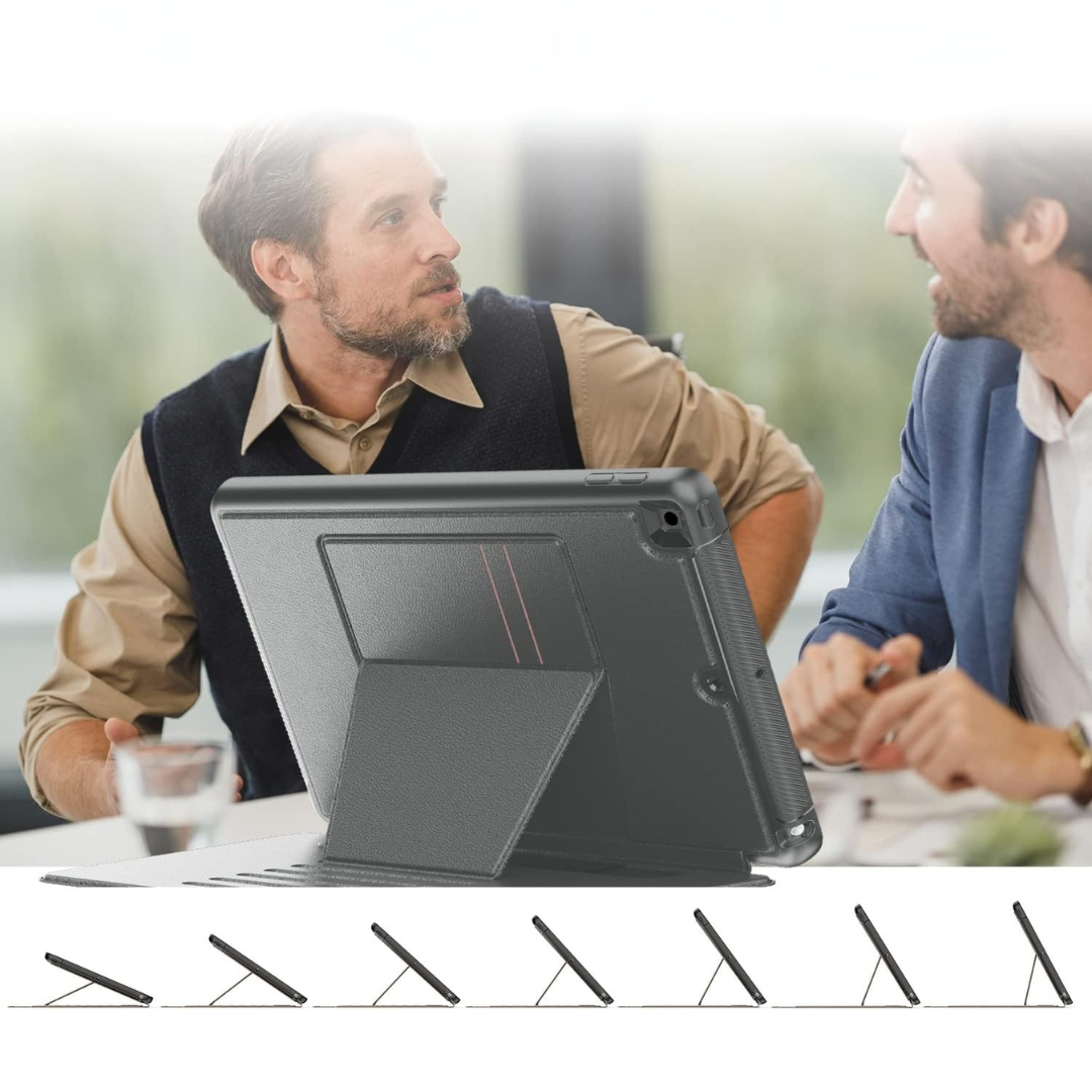 - Uchwyt z wieloma kątami nachylenia: etui umożliwia ustawienie iPada 9. generacji pod jednym z 7 różnych kątów. Pozwala to na wygodne dopasowanie pozycji do pisania lub oglądania, zapewniając lepsze podparcie nadgarstka i bardziej ergonomiczną postawę bez zbędnego napięcia.