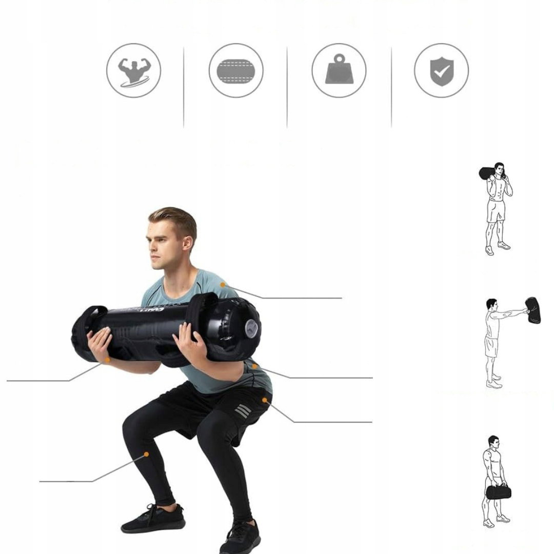 - Wzmacnianie siły i równowagi całego ciała: podczas treningu odczuwalna jest niestabilność wody, która przemieszcza się wewnątrz torby przy każdym ruchu. Nawet przy niewielkim przechyleniu ciężar przesuwa się z jednej strony na drugą, aktywując zarówno duże, jak i małe grupy mięśni w celu utrzymania równowagi i siły.
