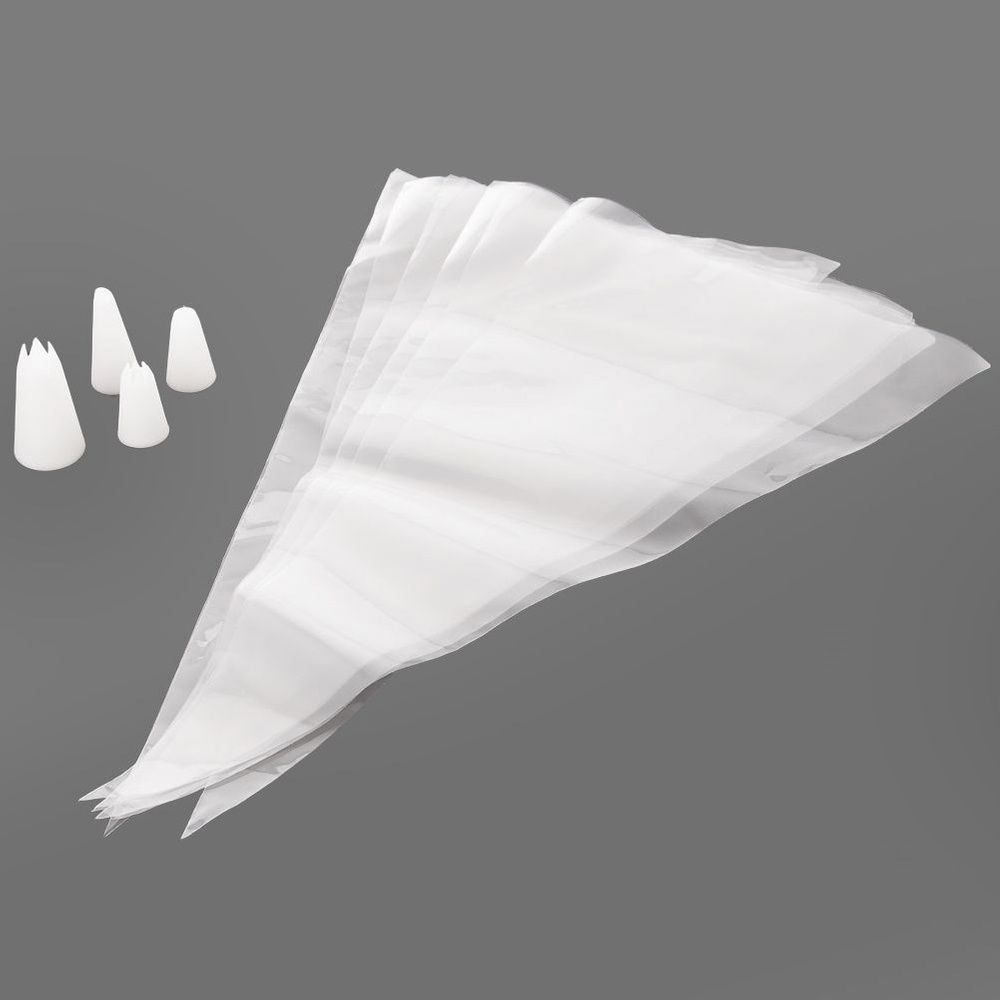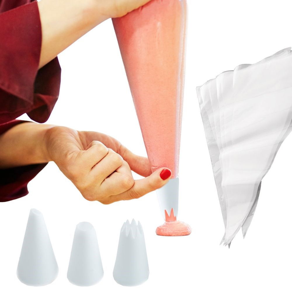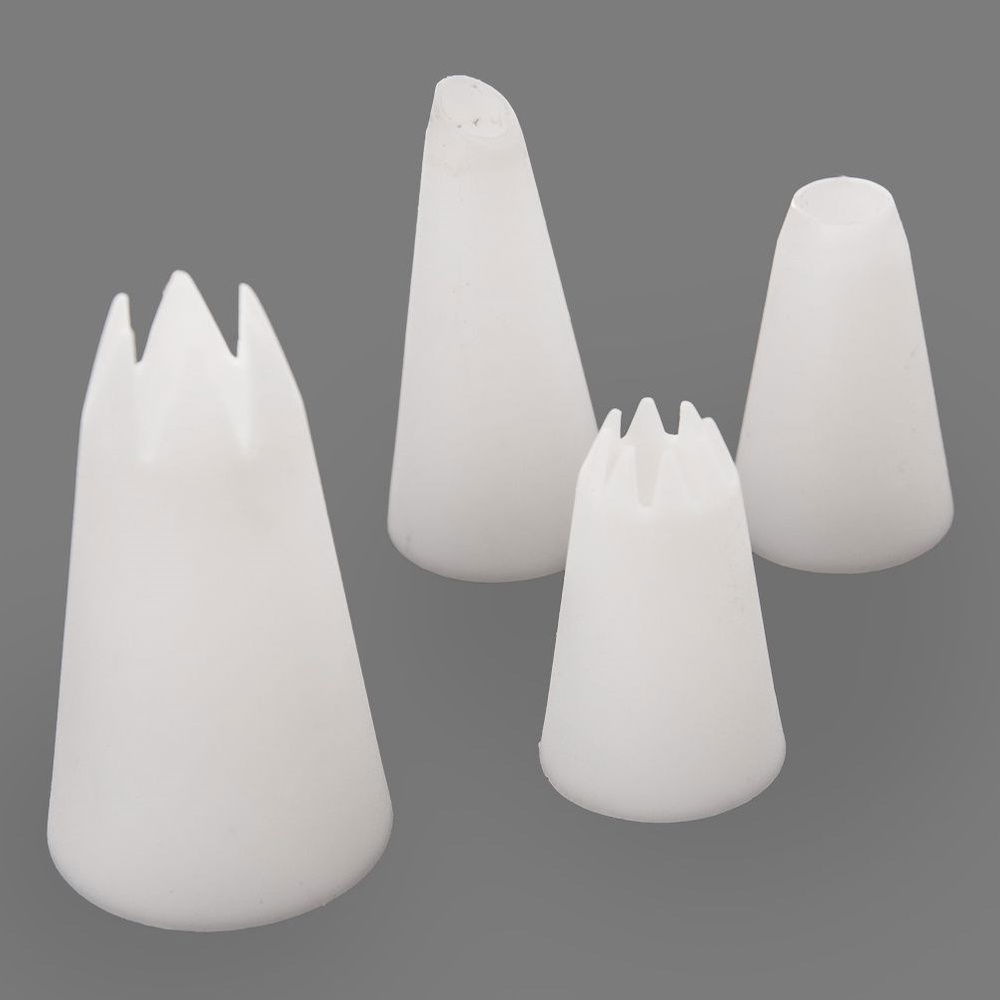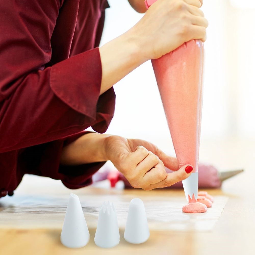 PRZYDATNY - Zestaw do dekorowania oraz nadziewania wyrobów cukierniczych. W zestawie 4 różne końcówki wielokrotnego użytku oraz 8 rękawów cukierniczych. Każdy rękaw cukierniczy ma długość 35 cm.