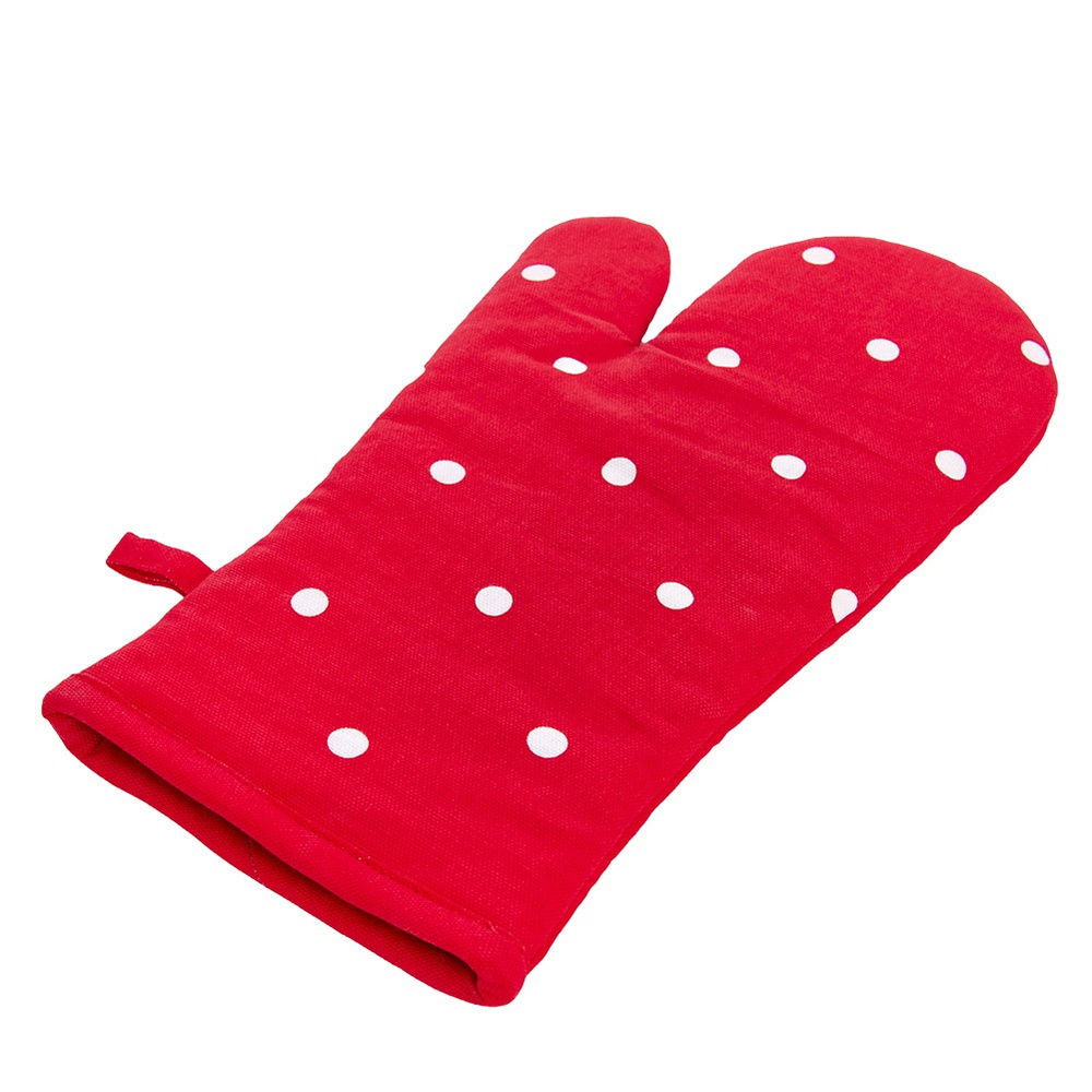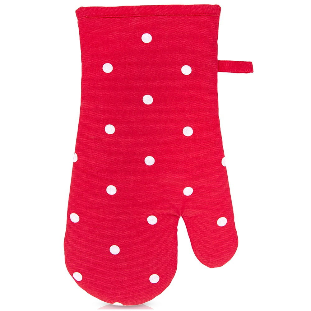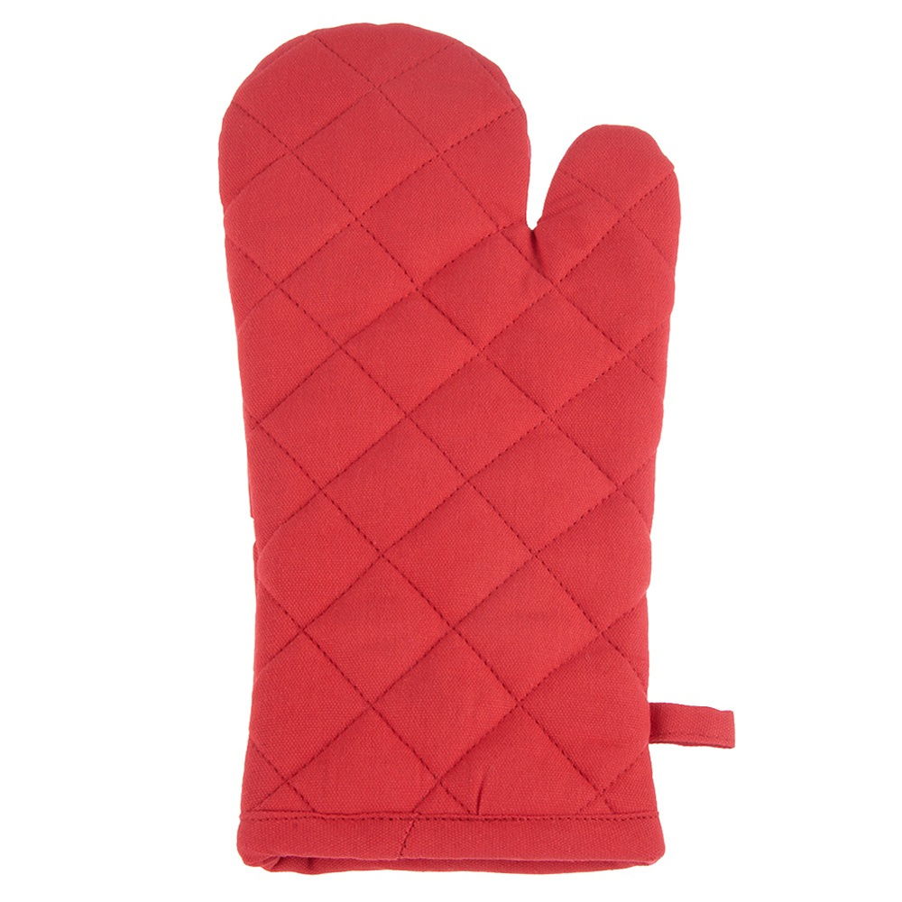Rękawica kuchenna wykonana z bawełny. Wyposażona w pętelkę do zawieszenia oraz magnes. Wygodna w użytkowaniu, odpowiednio przylega do dłoni chroniąc ją podczas gotowania lub pieczenia przed oparzeniami. Z pomocą rękawicy bez problemu przeniesiemy gorące naczynia.