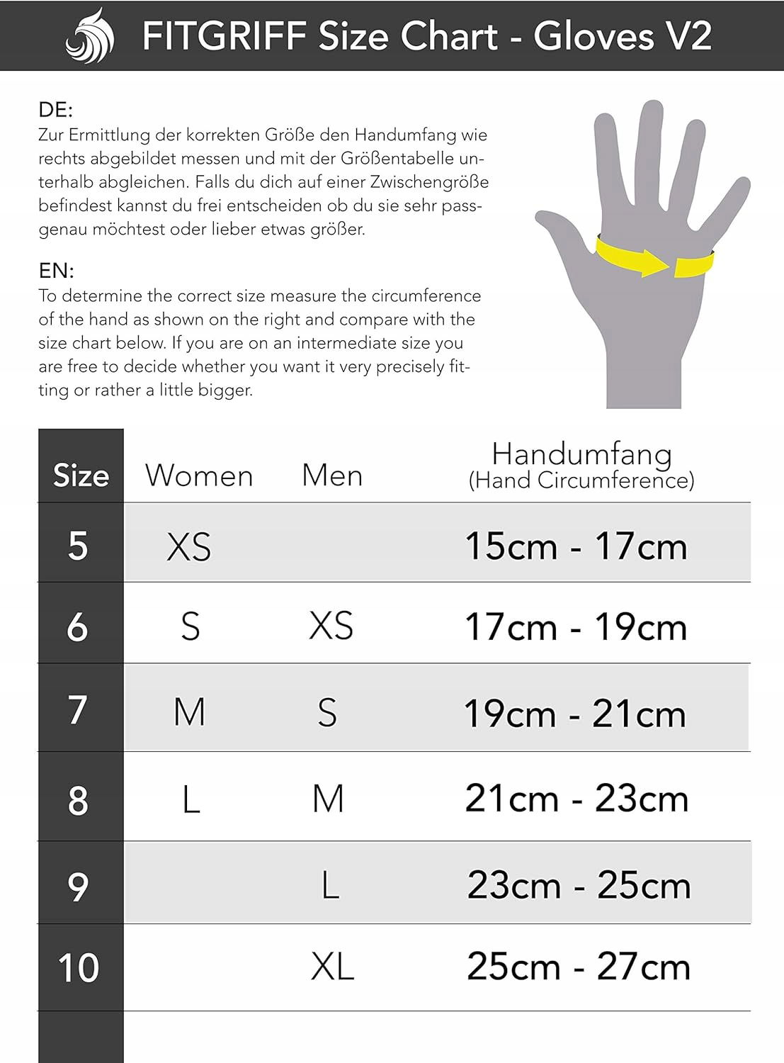 Informacje o rozmiarach i pielęgnacji: Aby ustalić właściwy rozmiar rękawiczek, zmierz obwód swojej dłoni i porównaj go z naszą tabelą rozmiarów (zobacz zdjęcia). Rękawice fitness można prać w pralce w temperaturze 30-40 stopni. Nie suszyć w suszarce bębnowej.