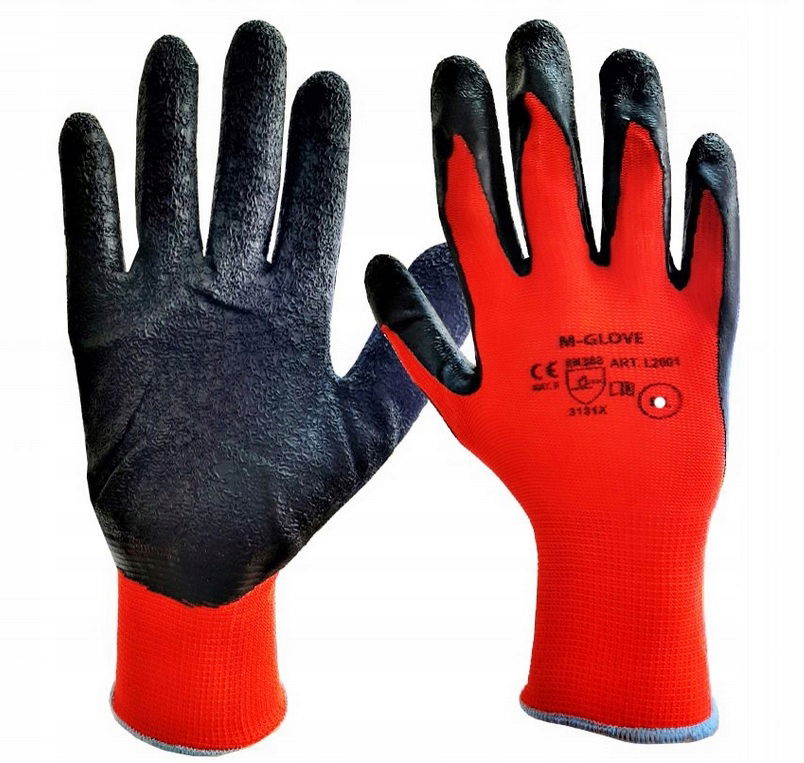 Rękawice ochronne wykonane z czerwonej dzianiny poliestrowej, powlekane miękkim odpornym na ścieranie lateksem w kolorze czarnym. Struktura gumy zapewnia wyśmienitą zręczność i bardzo dobrą przyczepność. Rękawice są często używane do wszelkiego rodzaju prac mechanicznych, ogrodowych, budowlanych oraz w gospodarstwach domowych.