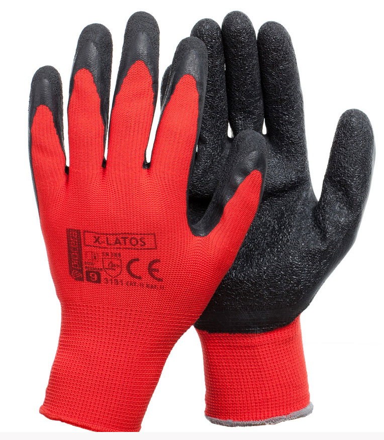 Rękawice X-LATOS wykonane z czerwonego poliestru, powlekane w części chwytnej lateksem o szorstkowanej strukturze. Idealne do prac manualnych. Bardzo dobra chwytność. Dobrze dopasowują się do kształtu dłoni. Rozciągliwe i elastyczne. Zakończone ściągaczem. CE EN 388. Kolor:czerwono/czarny.