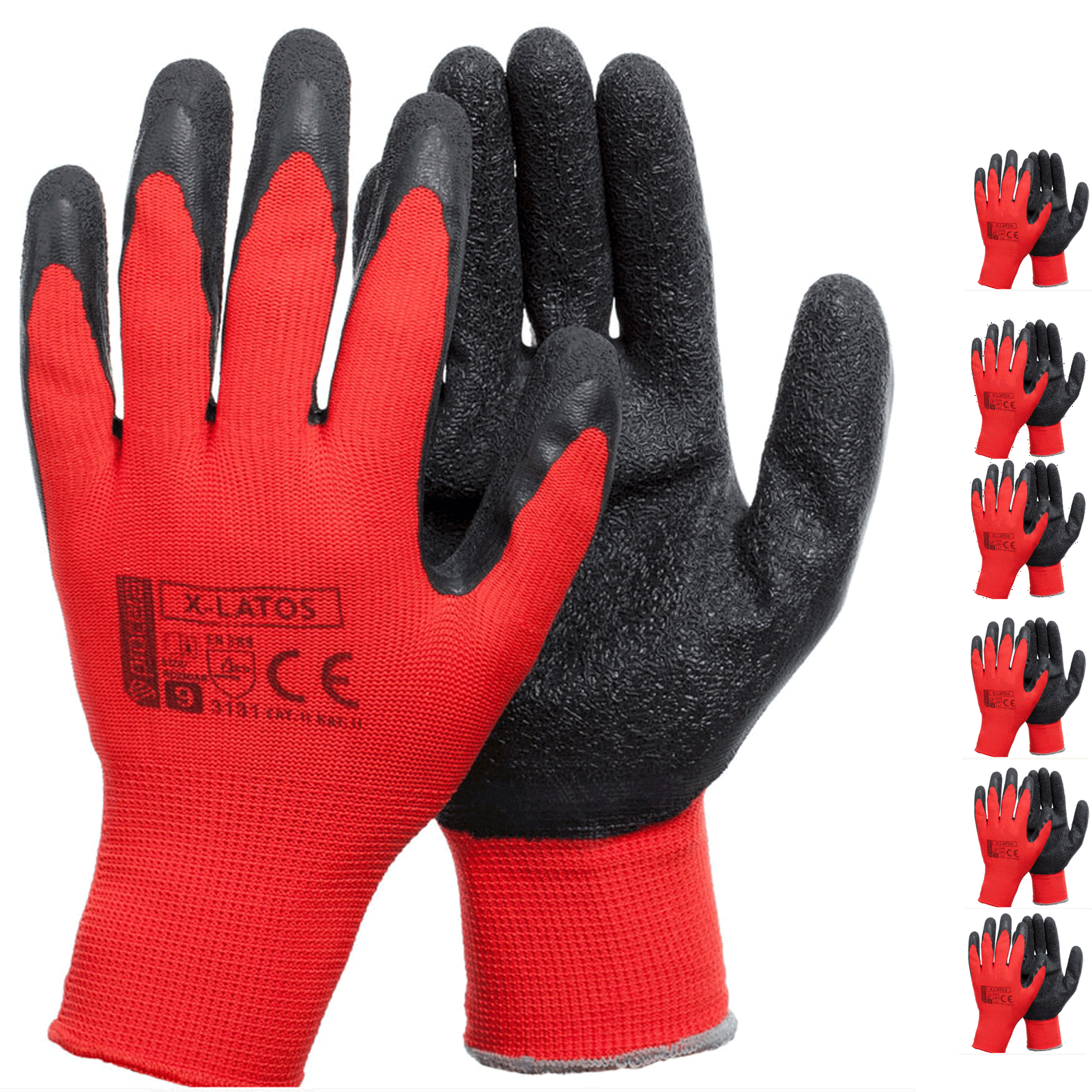Rękawice X-LATOS wykonane z czerwonego poliestru, powlekane w części chwytnej lateksem o szorstkowanej strukturze. Idealne do prac manualnych. Bardzo dobra chwytność. Dobrze dopasowują się do kształtu dłoni. Rozciągliwe i elastyczne. Zakończone ściągaczem. CE EN 388. Kolor:czerwono/czarny.