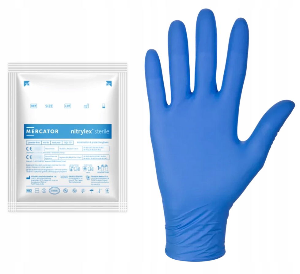 Jednorazowe rękawiczki nitrylowe w rozmiarze S renomowanej marki Mercator. Rękawiczki sterylne (pakowane parami w saszetki). Rękawiczki w kolorze niebieskim. Opakowanie zawiera 50 par rękawiczek.
