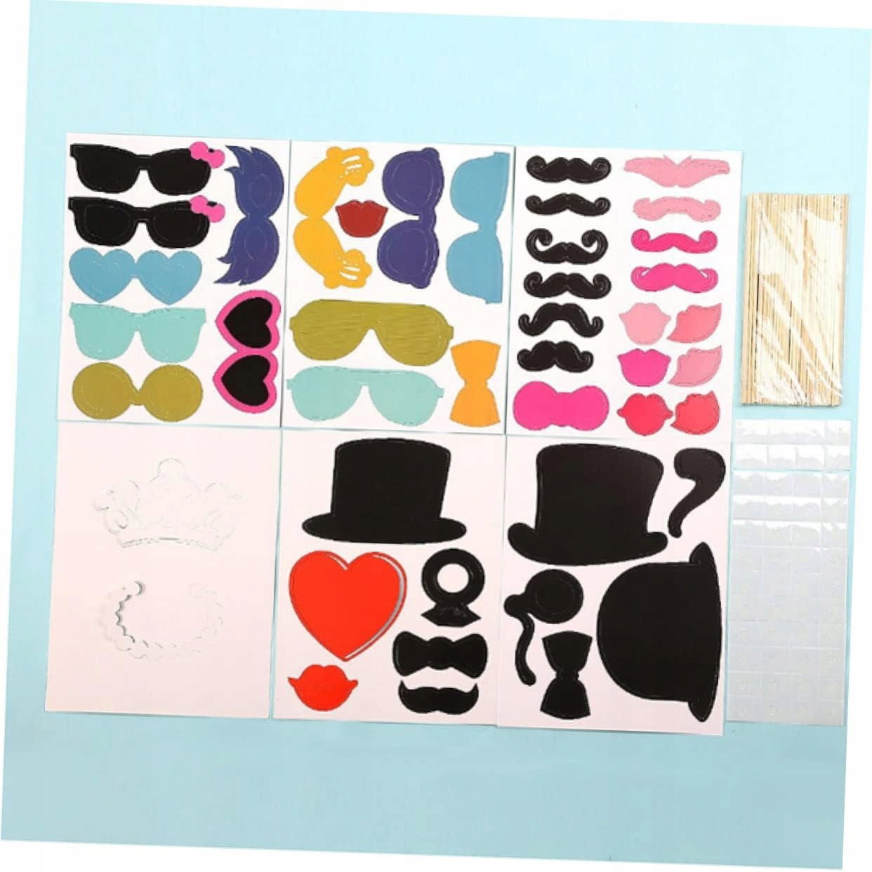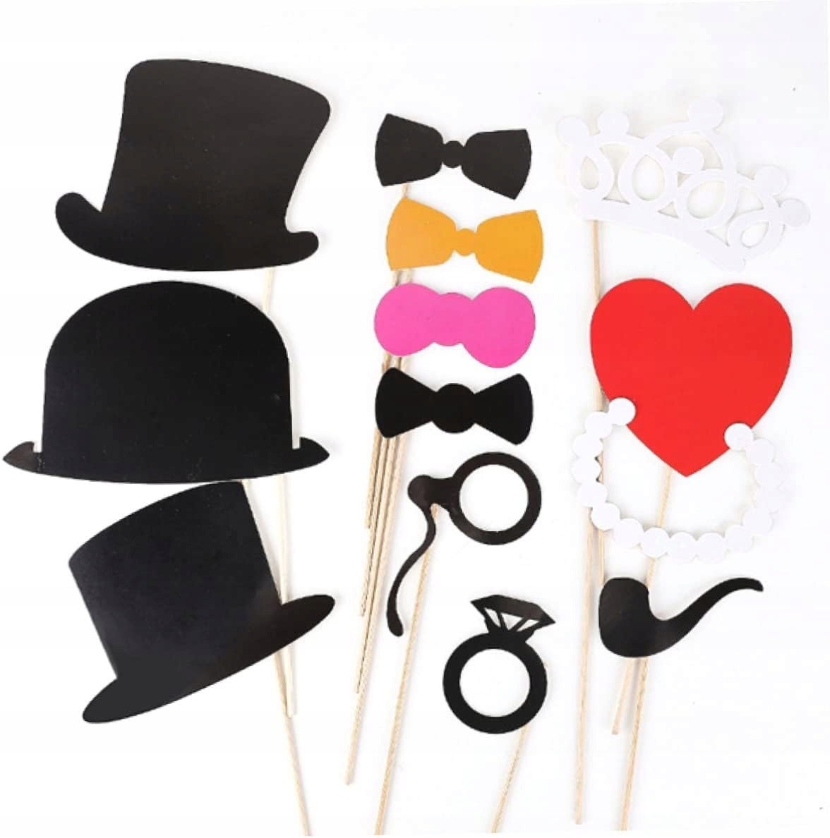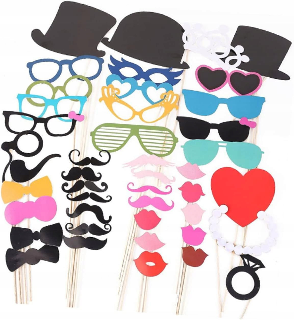 Rekwizyty do fotobudki patykach - obejmują głównie wąsy, okulary, czerwone usta, kapelusz, muszki itp.