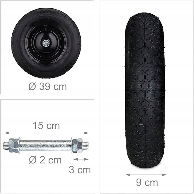 Podczas pracy w ogrodzie lub w domu przydatna jest niezawodna taczka, za pomocą której można przewozić gruz i inne przedmioty. To koło zapasowe 4,80 4.00-8 z oponami pneumatycznymi jest nie tylko odporne na wstrząsy dzięki łożyskom kulkowym i obręczom stalowym, ale jest również wyjątkowo wytrzymałe. Nawet ciężkie ładunki i nierówne podłogi nie stanowią przeszkody dla opon do taczek o profilu blokowym. Dzięki dołączonemu sworzniu osi i nakrętkom oponę zastępczą można zamontować bezpośrednio na taczce.