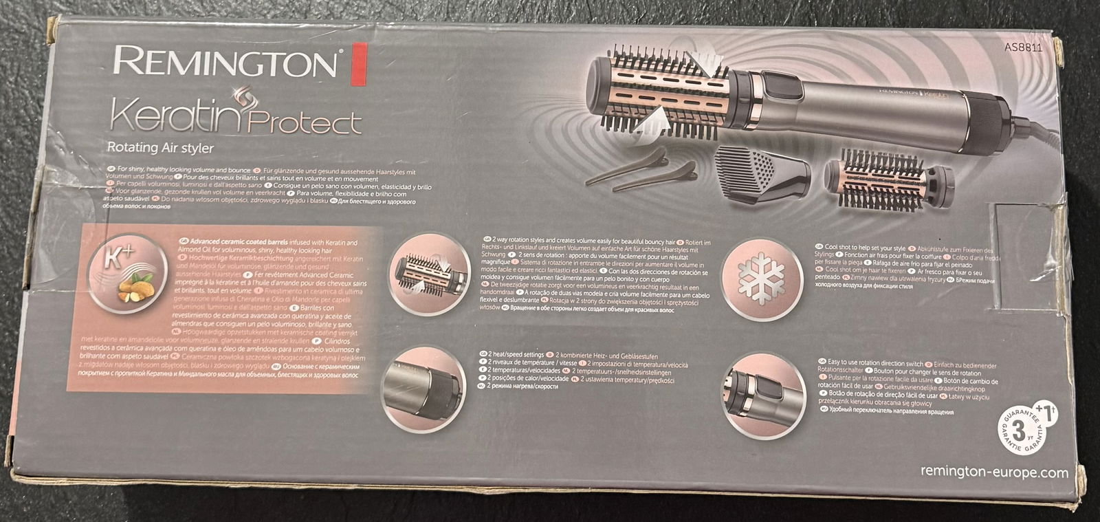 Technologia jonizacji: Urządzenie wykorzystuje technologię jonizacji, która redukuje statyczne naelektryzowanie włosów, zapewniając jednocześnie większy połysk. Różnorodność akcesoriów: Produkt zawiera różne końcówki, które umożliwiają zarówno suszenie, jak i stylizację włosów. Regulacja temperatury i prędkości: Remington AS8811 oferuje kilka opcji regulacji temperatury i prędkości, co umożliwia dostosowanie do różnych typów włosów i stylów. Bezpieczeństwo: Suszarka jest wyposażona w zabezpieczenie przed przegrzaniem, co gwarantuje bezpieczeństwo podczas użytkowania.