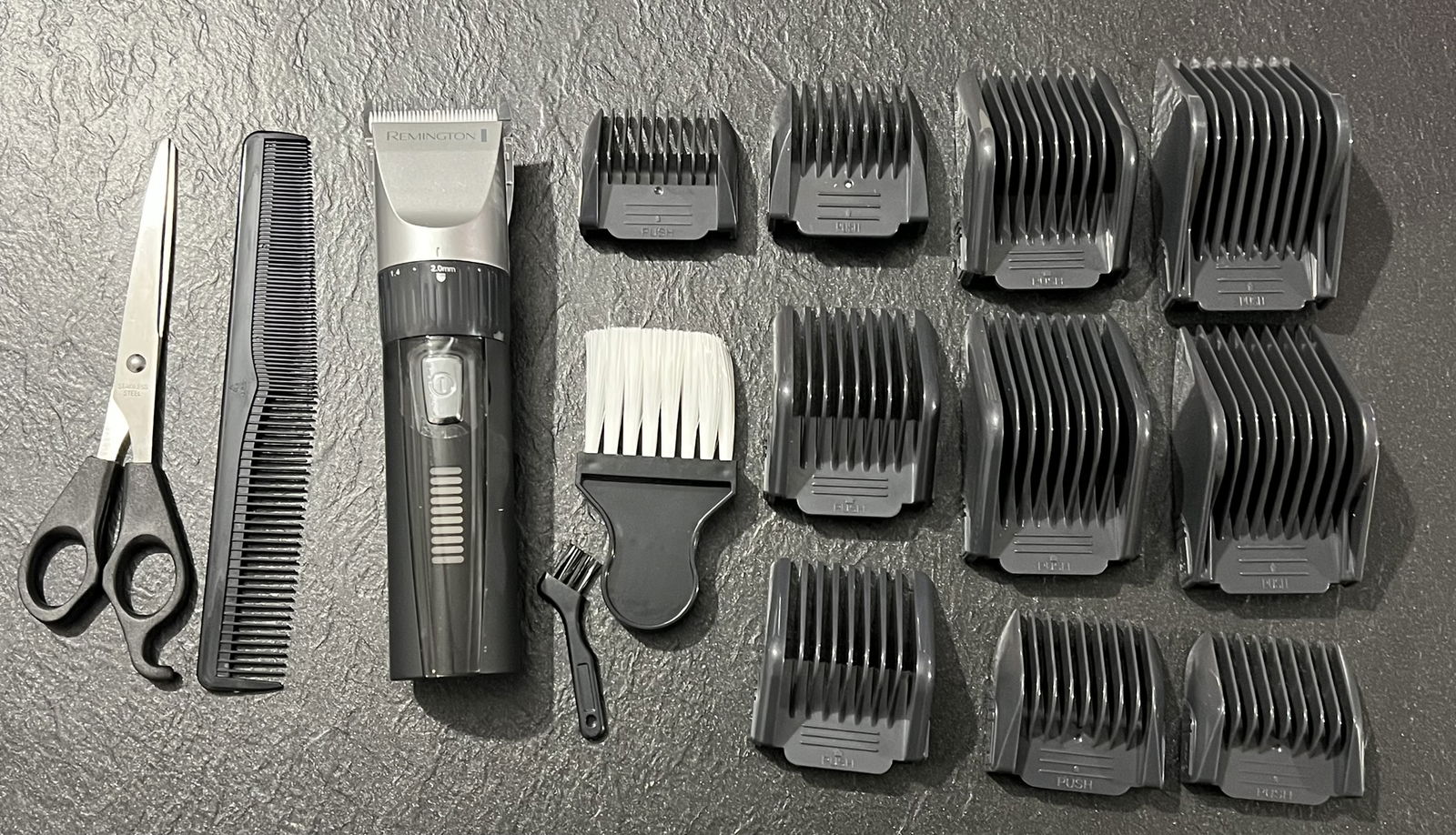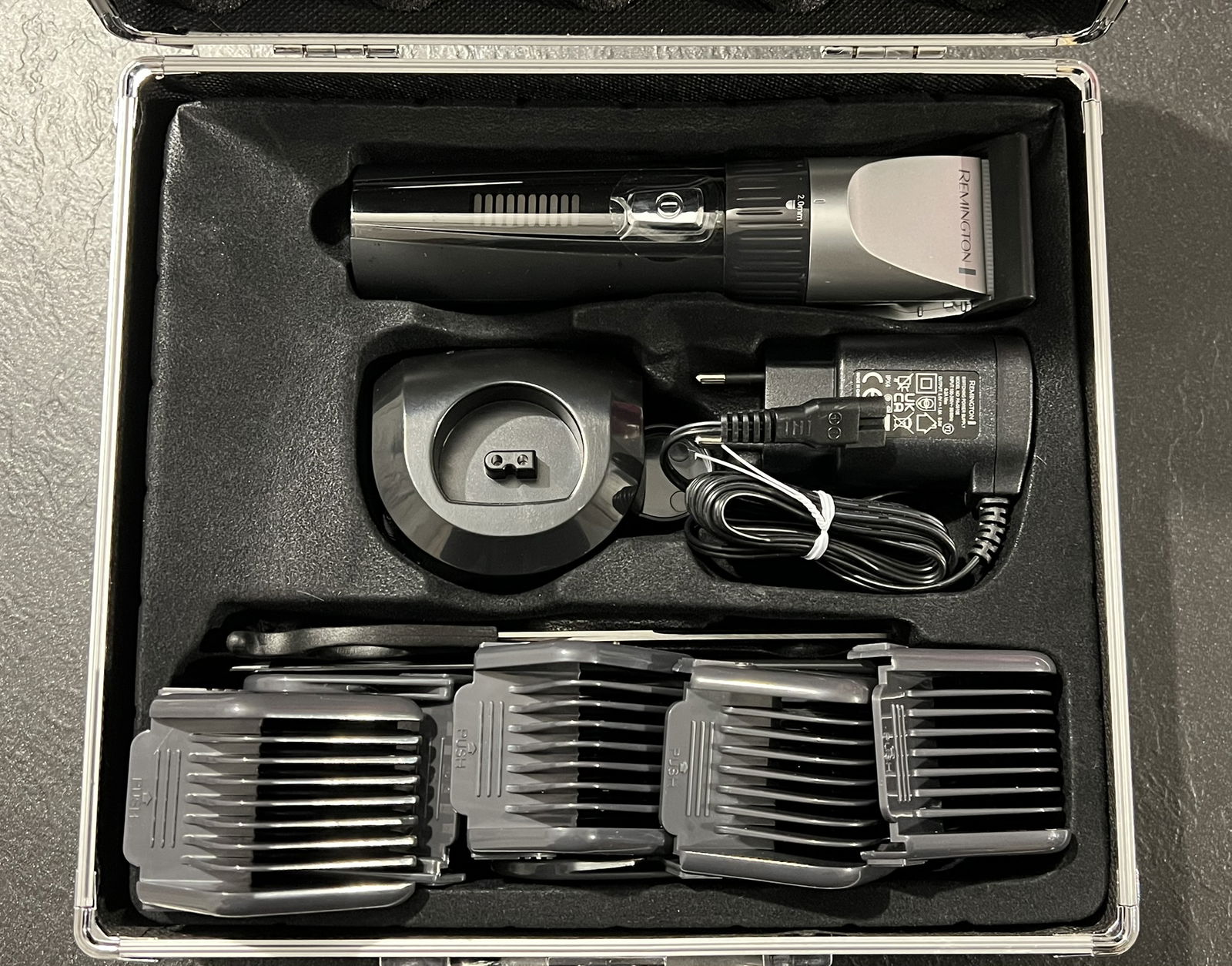 • 10 nasadek grzebieniowych (3-40 mm), wskaźnik stanu baterii LED, antypoślizgowy uchwyt, stacja ładująca