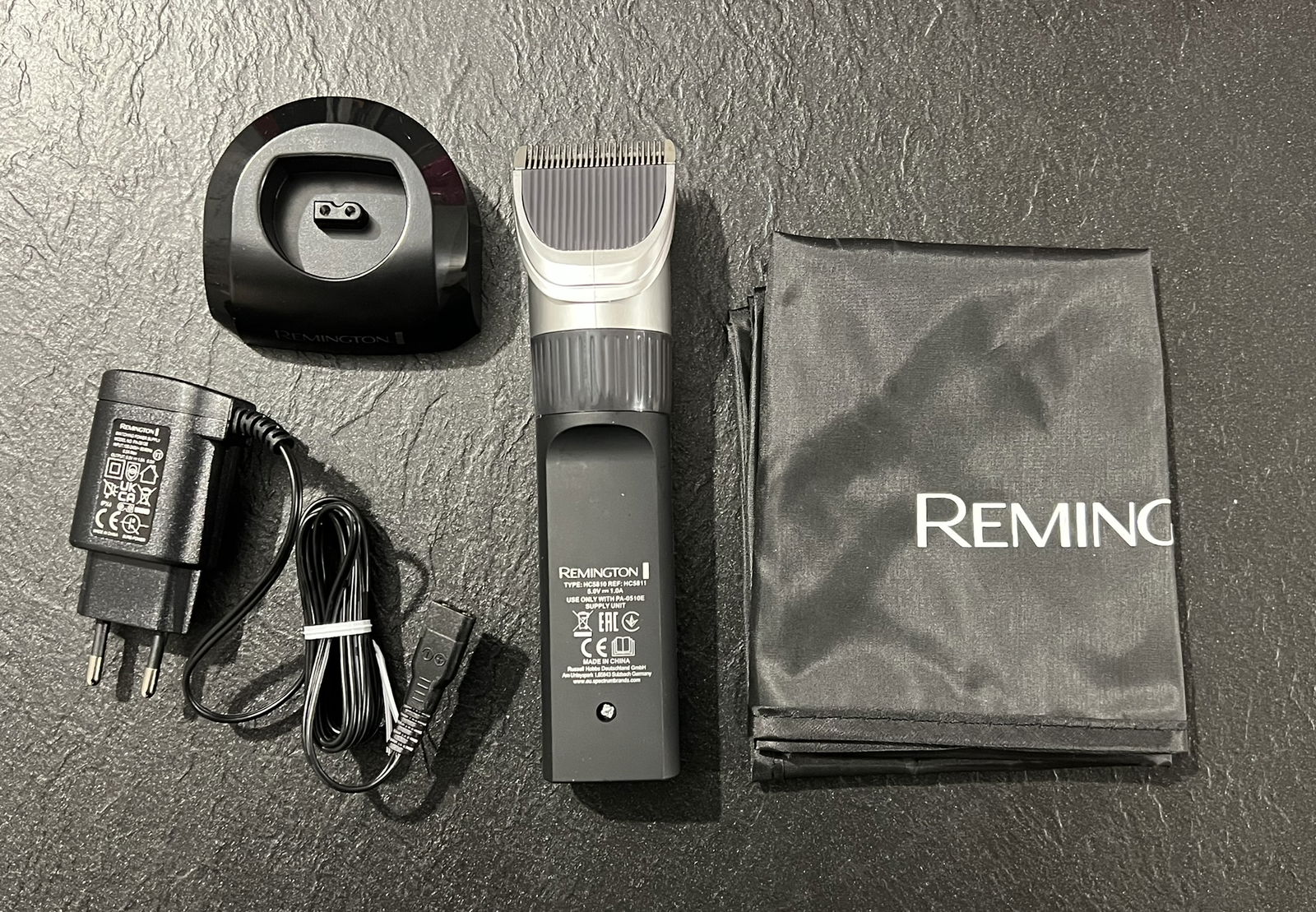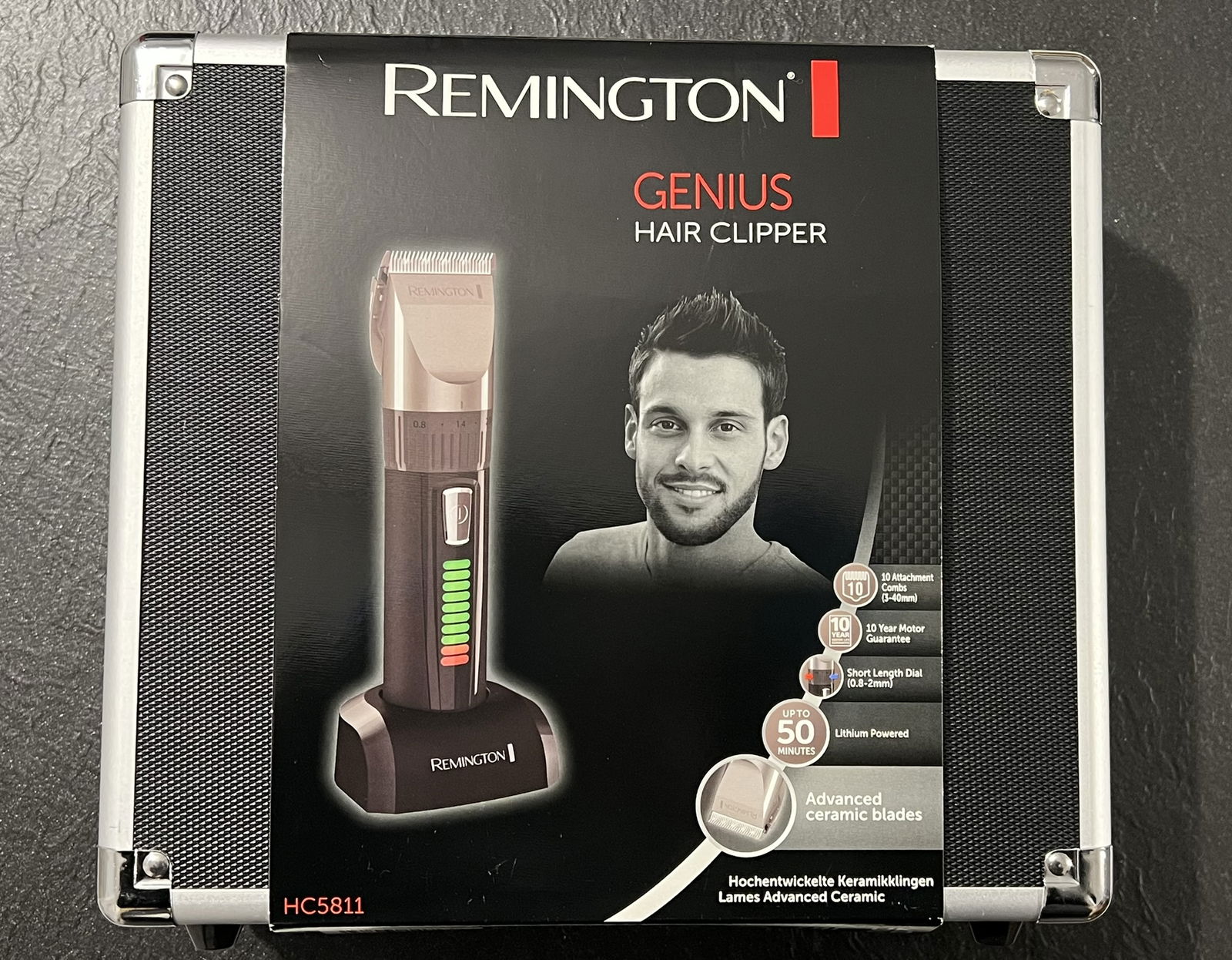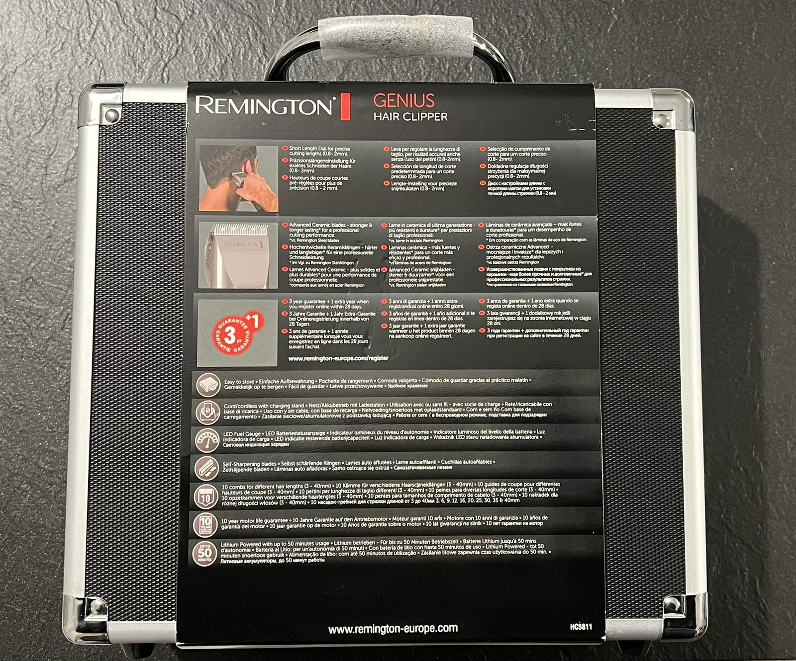 Remington maszynka do włosów, strzyżarka, bezprzewodowa, 10 nakładek 3-25mm, grzebień, nożyczki, szczoteczki, kuferek, podstawka ładująca, peleryna fryzjerska, czarna, HC5811 Genius