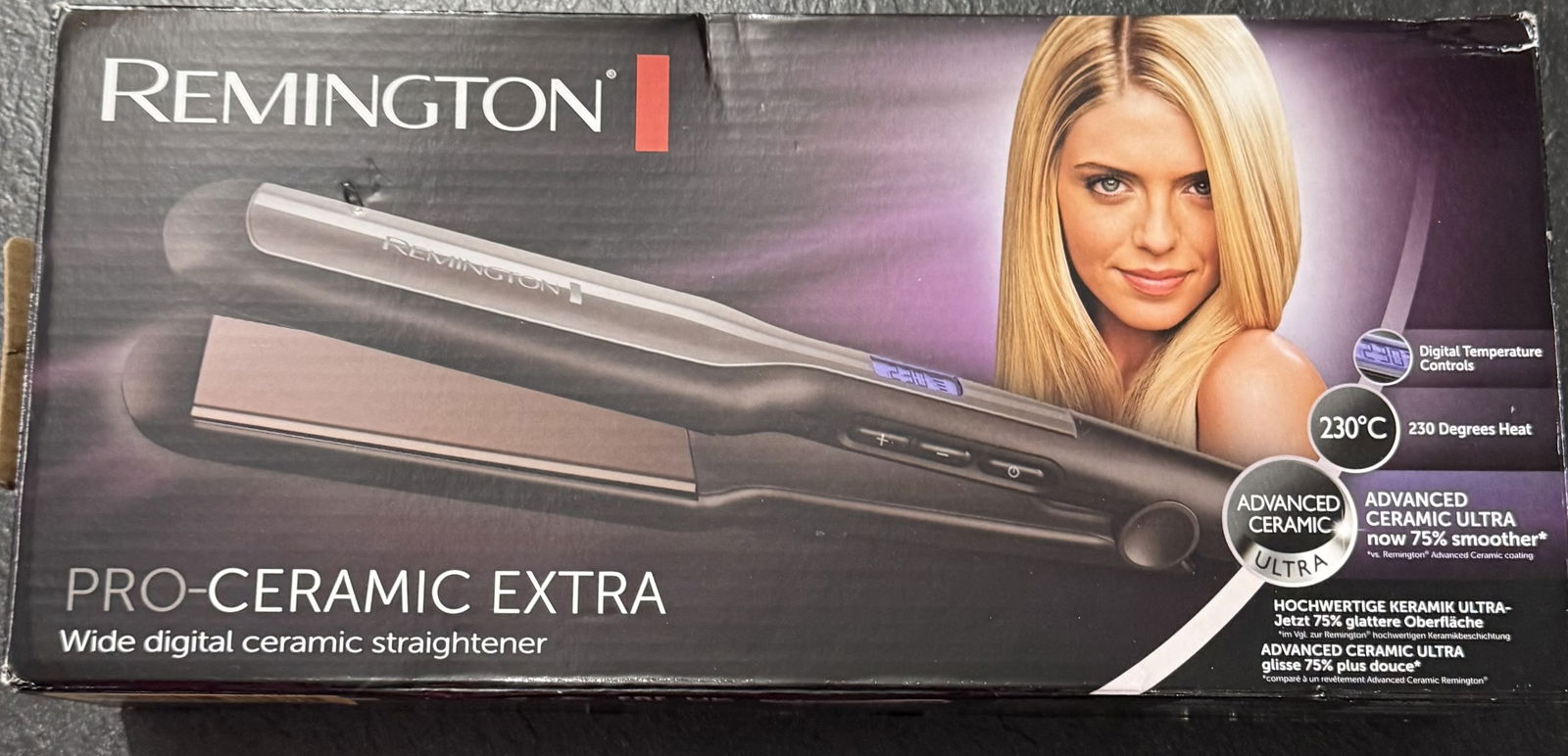 Remington prostownica do włosów, powłoka ceramiczna, szerokie płytki, zakres temp. 150-230°C, funkcja Turbo, szybkie nagrzewanie, ruchome płytki, etui w zestawie, czarna, Pro Ceramic Extra S5525