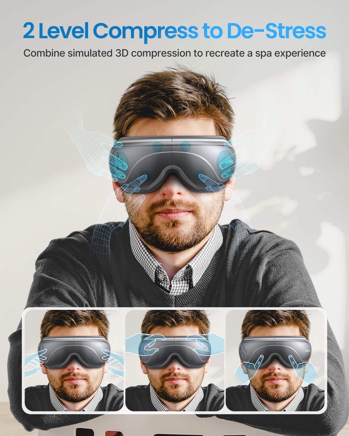 - 2 poziomy Com-pression & Heat Settings: Wybierz pomiędzy 2 regulowanymi ustawieniami intensywności kompresji, aby zwiększyć swój stan spokoju. Włącz kojące ciepło 40°C lub uzyskaj głębsze ciepło 42°C, aby pomóc w obrzękach oczu, suchości oczu i wielu innych.