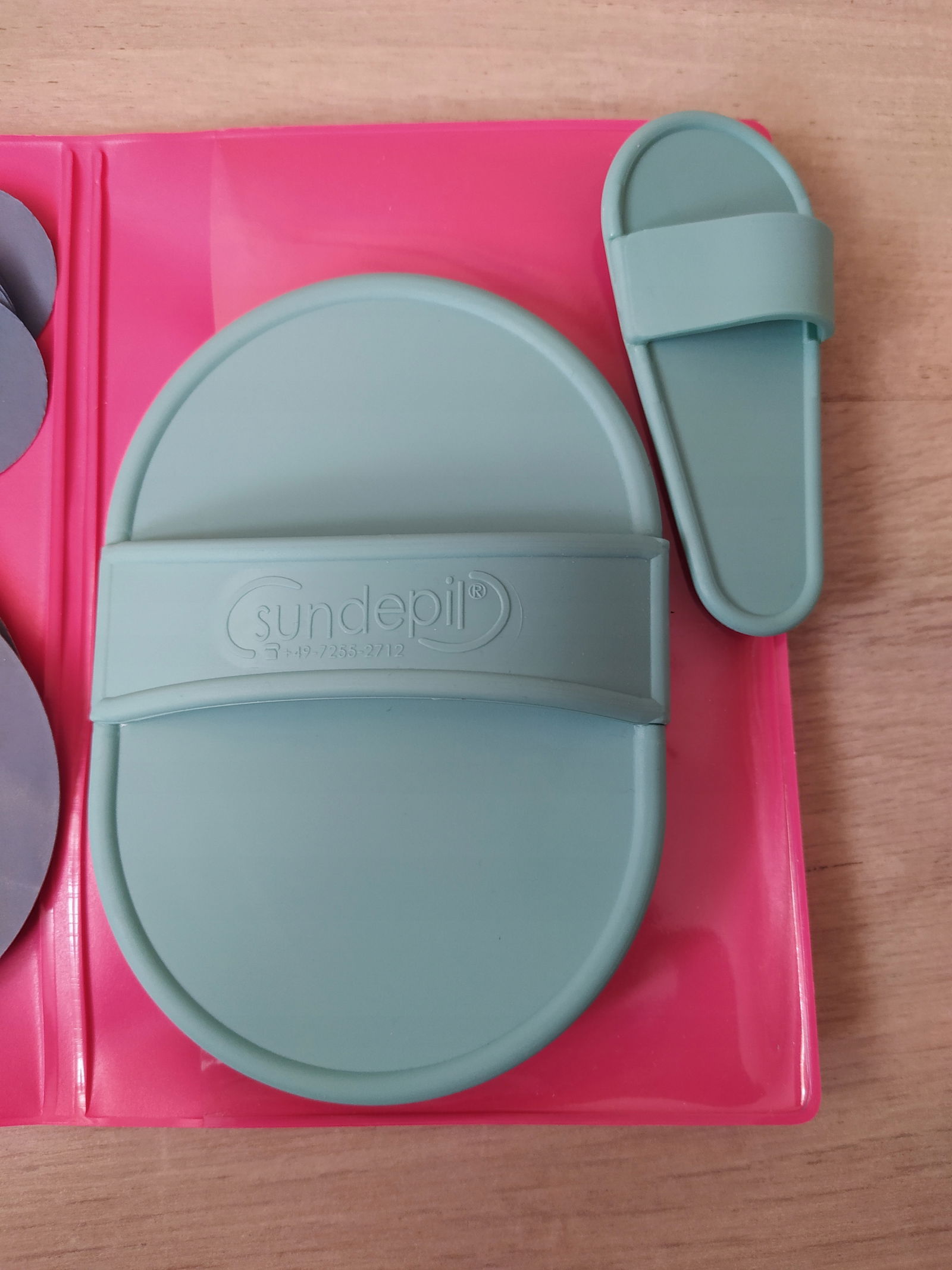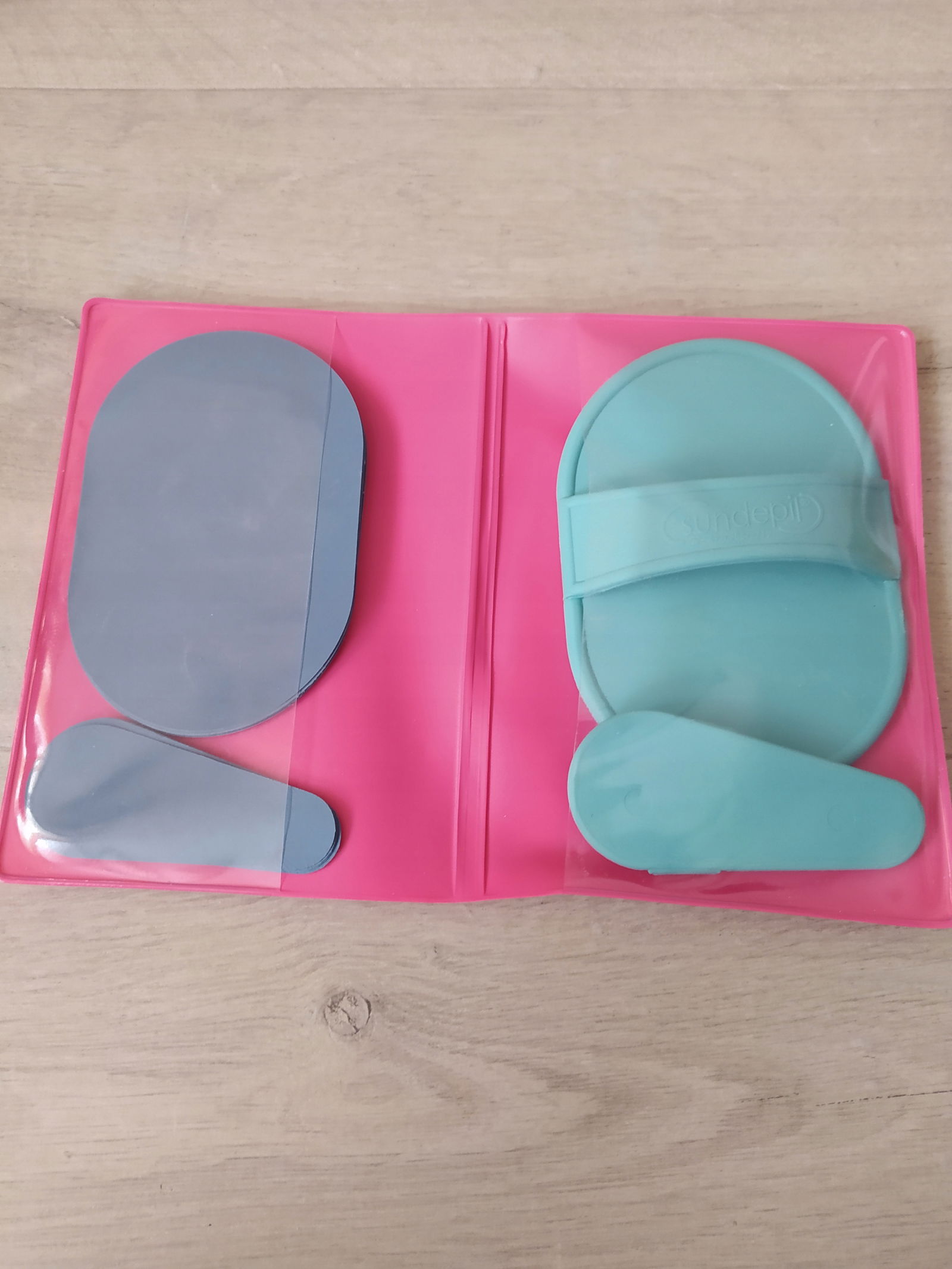 Zawartość zestawu Zestaw do depilacji Moondepil: 1 etui do przechowywania, 1 rękawica do depilacji Moondepil (zielona lub różowa), 1 mała rękawica do depilacji Moondepil (zielona lub różowa), 4 duże wymienne krążki, 4 małe wymienne krążki