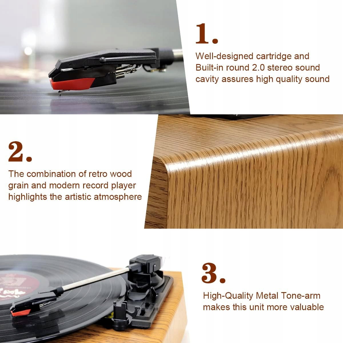 Wygląd retro i nowoczesne połączenie: Dzięki wspaniałemu naturalnemu drewnu i fascynacji stylem vintage w połączeniu z nowoczesną technologią, ten klasyczny odtwarzacz LP jest idealnym wyborem dla początkujących pasjonatów muzyki klasycznej. Domowe odtwarzacze płyt audio w stylu retro są idealnym prezentem dla przyjaciół i rodziny.