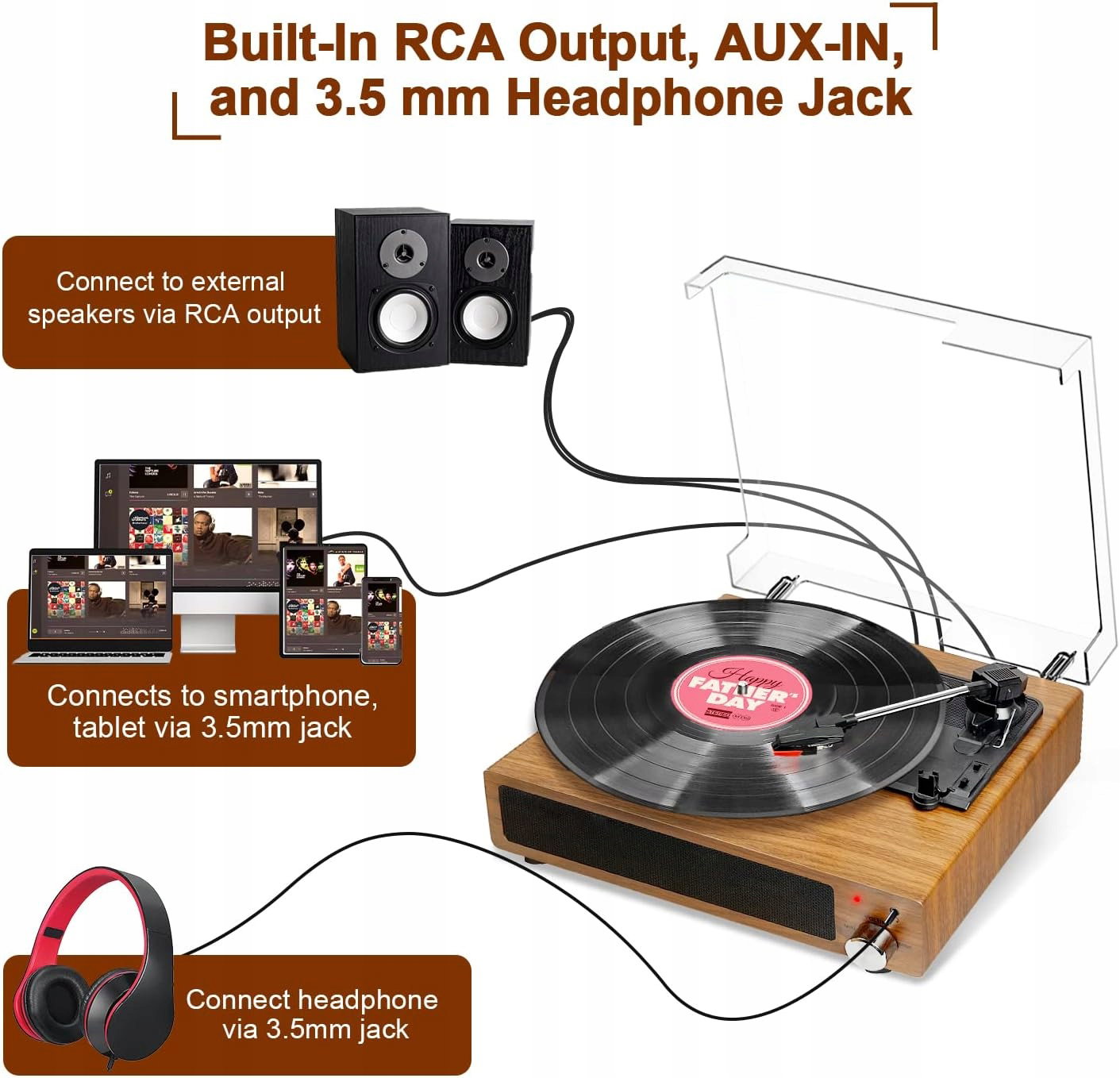 Funkcja Bluetooth, RCA i AUX: Zintegrowany z funkcją Bluetooth, ten gramofon może działać jako głośnik Bluetooth do odtwarzania nowoczesnej muzyki cyfrowej z urządzenia Bluetooth (Wskazówki: Działa tylko jako odbiornik Bluetooth). Wyjście audio RCA umożliwia podłączenie do zewnętrznego wzmacniacza domowego lub innych głośników surround, a port AUX IN zapewnia jeszcze więcej opcji do codziennego użytku, umożliwiając swobodne słuchanie muzyki.