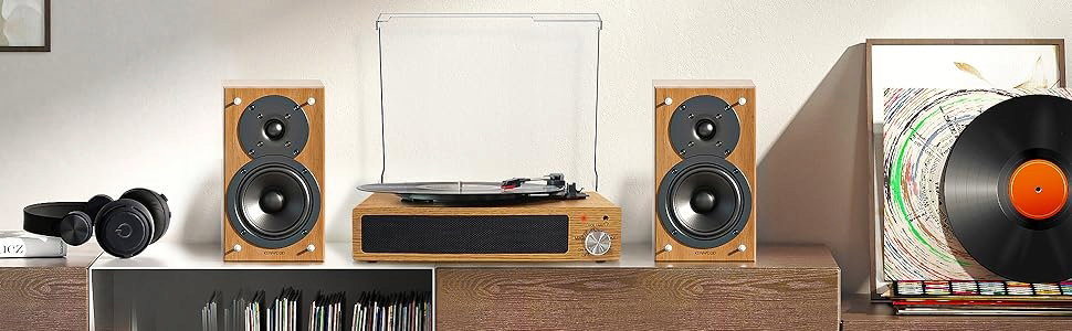 Wbudowane 2 pełnozakresowe głośniki stereo zapewniają czysty, wysokiej jakości dźwięk stereo z dobrymi basami i wysokimi tonami, dzięki czemu można naprawdę docenić ciepłe, głębokie brzmienie płyt winylowych. Jest to atrakcyjny wybór dla tych, którzy lubią muzykę z poczuciem podróży w czasie.