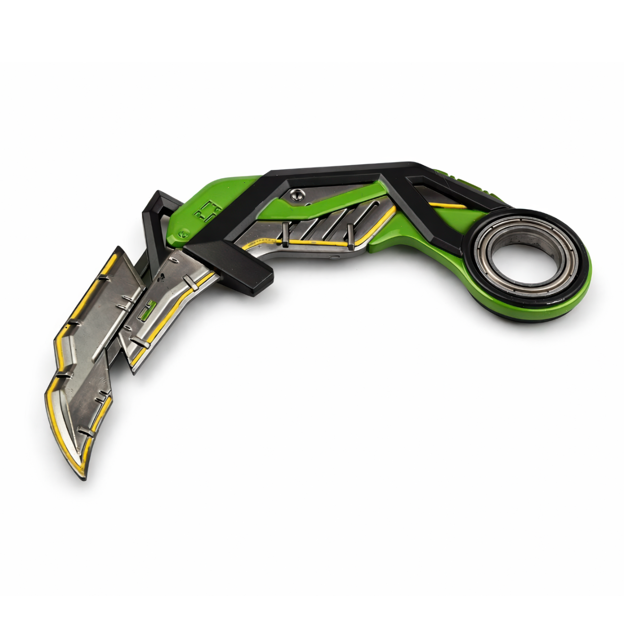 Jeśli chcesz, żeby Twoje EDC wyglądało jak wyjęte prosto z neonowego buy phase’a, RGX11z Pro Karambit przenosi ten futurystyczny klimat Valoranta na co dzień. To 17 cm Metal Keychain, który robi efekt „premium skina” na plecaku, kluczach albo ita bagu — taki detal, który od razu pokazuje zajawkę, bez tłumaczenia się komukolwiek. Projekt uderza mocnym kontrastem: soczysta zieleń zestawiona z kanciastą, matowo-czarną ramą i jasnymi, srebrnymi panelami przypominającymi ostrze, z wyraźnymi ścięciami i segmentami jak w sprzęcie high-tech. Cienkie żółte linie biegną po krawędziach jak podświetlane „obwody”, a wgłębienia, wycięcia i widoczne detale „śrubek” dodają mu mechanicznej, warstwowej głębi — dokładnie jak w estetyce skinów i interfejsu Valoranta. Charakterystyczny okrągły ring jest wbudowany w formę, więc sylwetka karambita jest od razu rozpoznawalna. Dorzuć go do swojej kolekcji albo podaruj komuś, kto żyje dla tej next-level kosmetyki.