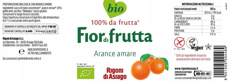 Arance amare o lekko gorzkim i pysznie kwaśnym smaku jest produkowana z ekologicznych gorzkich pomarańczy, które są zbierane ręcznie w rejonie Etny na Sycylii. Dzięki zakresowi temperatur typowemu dla obszaru pochodzenia te owoce cytrusowe rozwijają wewnętrzną pigmentację, która jest unikalna na świecie. Fiordifrutta pomarańczowa jest doskonała w połączeniu z deserami na bazie kawy, jogurtu i koktajli. Dobrze komponuje się również z mortadelą oraz kozimi serami.