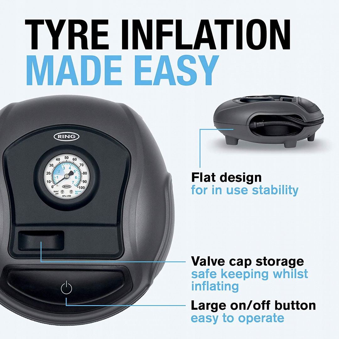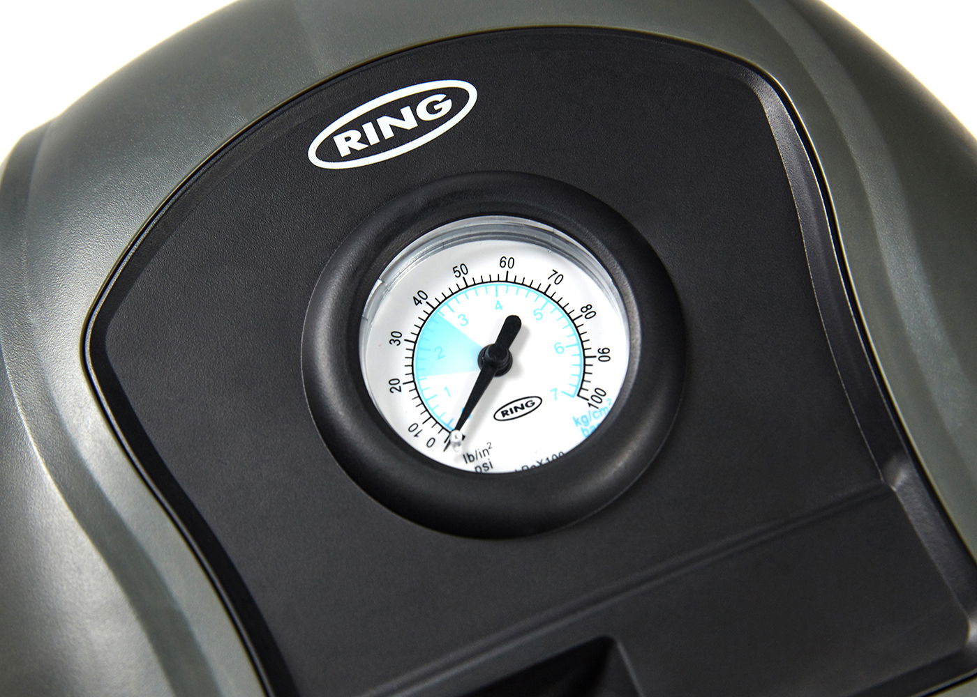 Analogowy inflator opon RTC100 z dużym przyciskiem włączania / wyłączania dla łatwości użytkowania. Jego stabilna konstrukcja utrzymuje inflator podczas pracy.