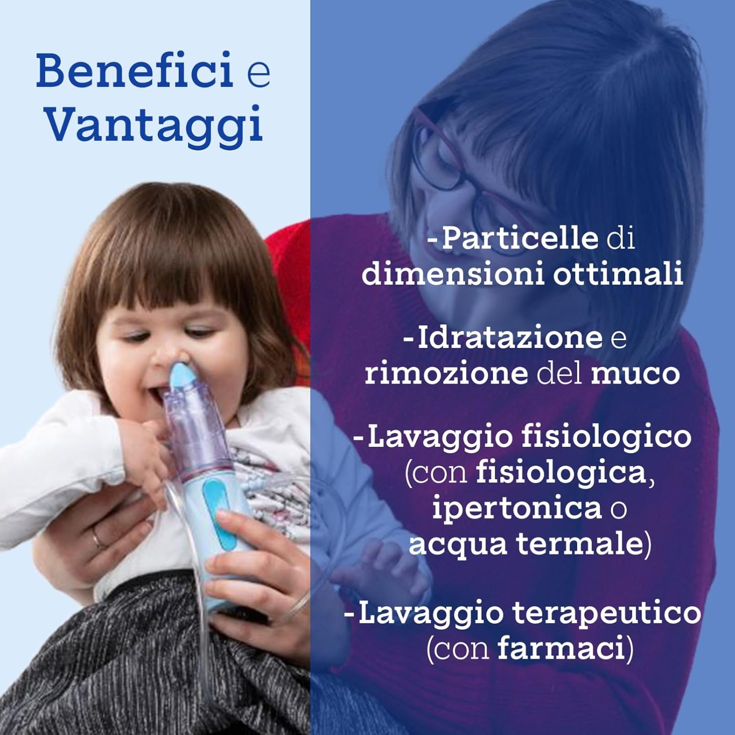 • dzięki nebulizacji roztworu gwarantuje jednolity rozkład w całej jamie nosowej, sprzyjając nawodnieniu, fluidyfikacji i usuwaniu śluzu i flegmy