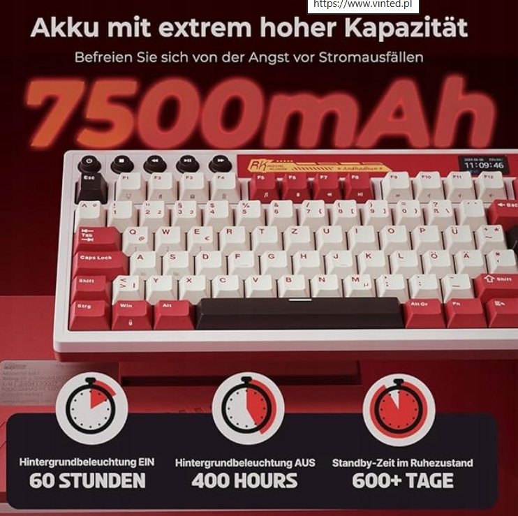 Inteligentny wyświetlacz LCD – pokazuje czas, poziom baterii, połączenie i GIF-y. Dwa funkcjonalne pokrętła – regulacja ustawień klawiatury i głośności z osobnych przycisków. Konstrukcja Gasket Mount z tłumieniem – 5-warstwowa struktura zapewnia ciche i przyjemne pisanie. Akumulator 7500 mAh – aż do 400 h pracy bez podświetlenia i 600 dni w trybie czuwania! Tryb potrójny: BT 5.1 / 2.4 GHz / USB-C – idealna do PC, Mac, laptopów i urządzeń mobilnych. Hot-swap 3/5 pin – kompatybilna z większością przełączników mechanicznych, możliwość łatwej wymiany.