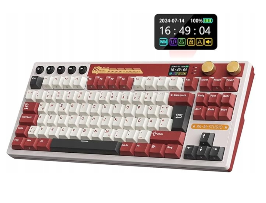 Poznaj nowoczesną klawiaturę mechaniczną RK M87 stworzoną z myślą o graczach, programistach i fanach personalizacji! Ten zaawansowany model oferuje nie tylko inteligentny wyświetlacz LCD i dwa pokrętła do kontroli, ale także wysokiej klasy konstrukcję Gasket Mount, wbudowane tłumienie dźwięku i trzy tryby łączności. Dzięki akumulatorowi 7500 mAh i przełącznikom hot-swap możesz pracować lub grać bez przerwy – na Twoich zasadach.
