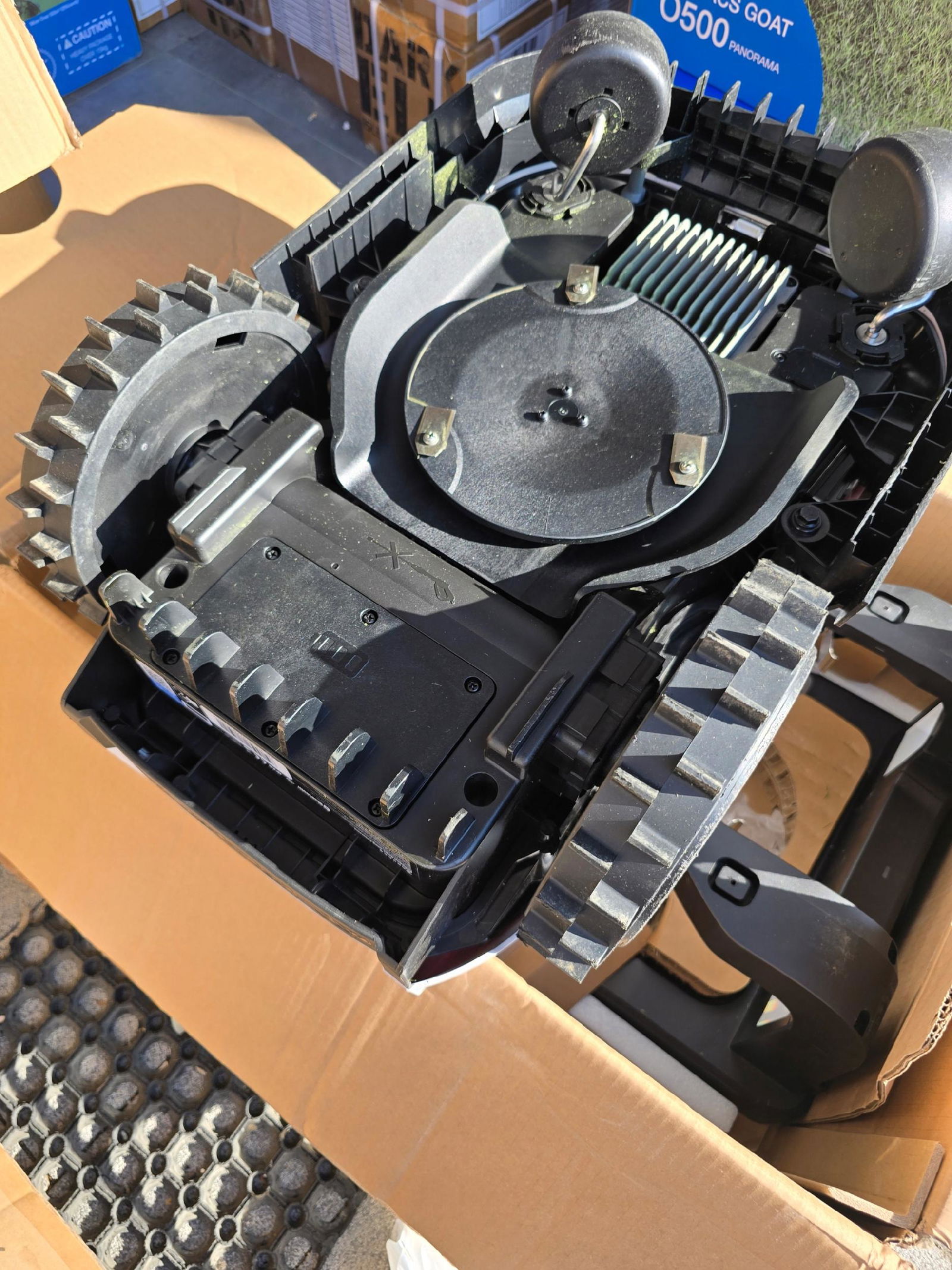 Robot koszący GOAT O500 Panorama, stacja ładująca, osłona stacji ładującej, szczotka do kamery, zasilacz, 6 gwoździ mocujących do stacji ładowania, klucz imbusowy, zestaw zapasowych ostrzy (9 ostrzy i 9 śrub), dokumentacja.