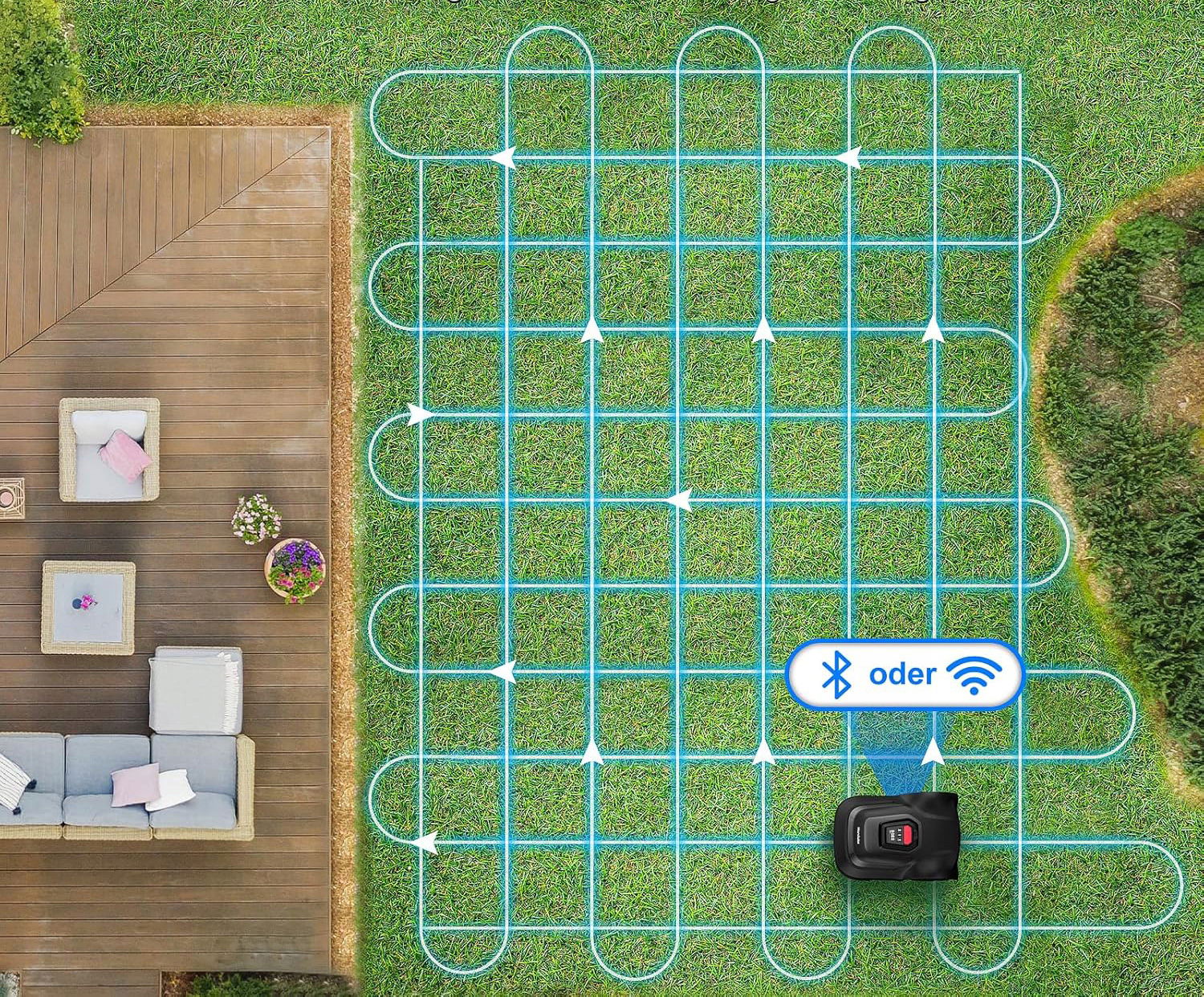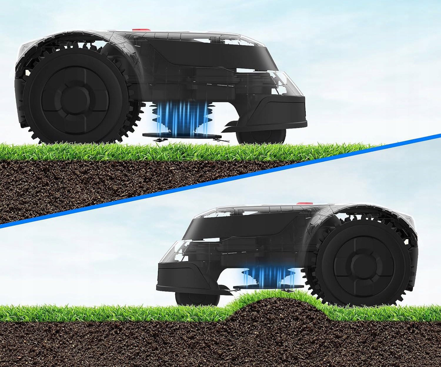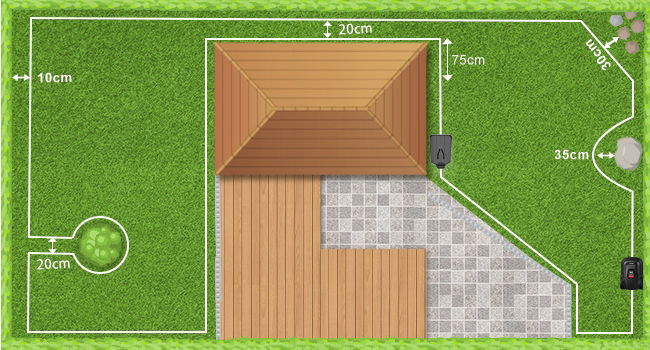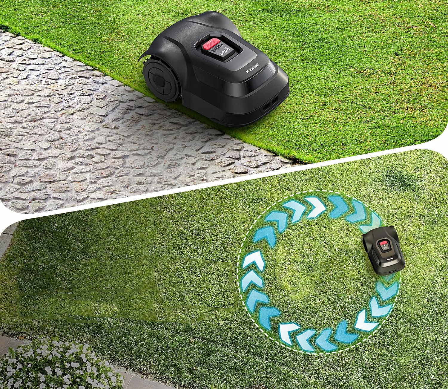 Robot koszący, kierowany precyzyjną technologią pozycjonowania i inteligentnym algorytmem, podąża zaplanowanymi ścieżkami i tworzy piękne, równomierne paski na trawniku. Zintegrowany podwójny czujnik (czujnik bezwładności + czujnik kolizji) skutecznie wykrywa przeszkody, takie jak doniczki kwiatowe. Czujnik kolizyjny C-TOF zapewnia bezpieczniejsze i spokojniejsze wrażenia podczas koszenia.