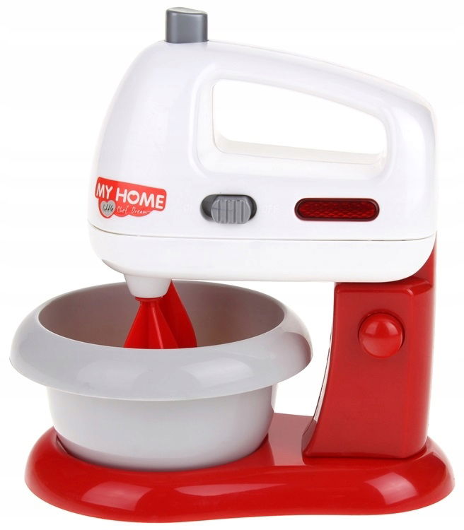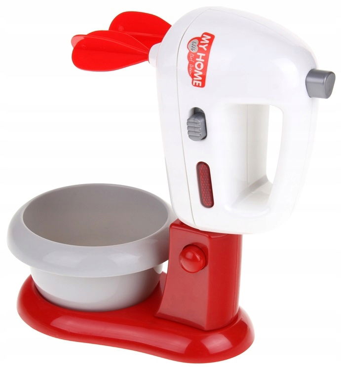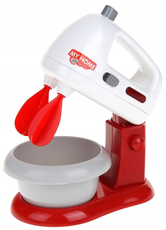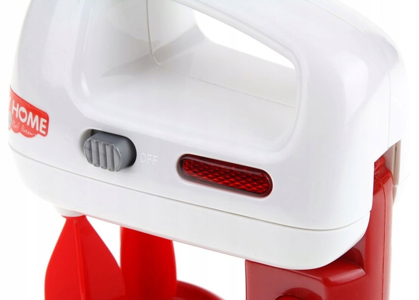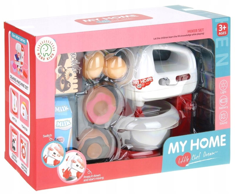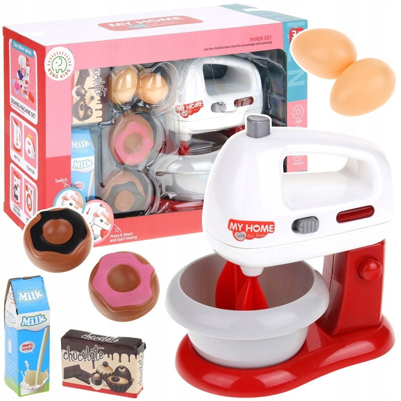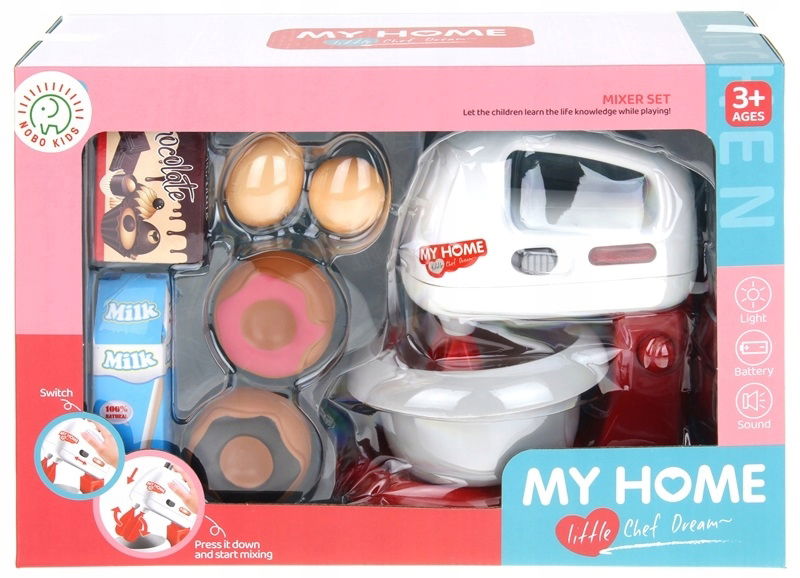 W zestawie znajduje się robot kuchenny oraz akcesoria spożywcze. Mikser działa w dwóch trybach, po przełączniku włącznika na ON- śmigiełka działają cały czas, po przełączeniu na OFF i naciśnięciu przycisku u góry, sami kontrolujemy obracanie się śmigiełek. Pracy miksera towarzyszy czerwone światełko oraz dźwięk jak w prawdziwym mikserze. Główkę miksera można odczepić od podstawy, wtedy pełni on funkcje miksera ręcznego. Akcesoria spożywcze znajdujące się w zestawie to: 2 pączki, 2 jajka, pudełeczko z napisem czekolada oraz mleko. Ten zestaw to nieodłączny element wyposażenia dziecięcej kuchni oraz idealny produkt dla przyszłego profesjonalnego kucharza.