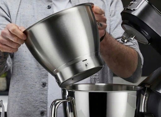 - Dwie misy z wysokiej jakości stali nierdzewnej o pojemności 5L i 3,5L zwiększają komfort pieczenia i gotowania. Misa o pojemności 3,5L mieści się w środku większej, co ułatwia ich przechowywanie. Wszystkie przystawki i akcesoria są kompatybilne z obiema misami