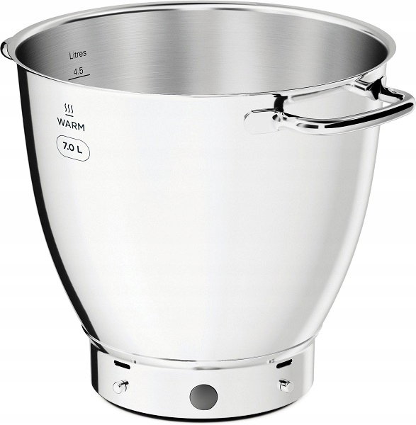 - Robot został wyposażony w dużą, wykonaną ze stali nierdzewnej, misę o pojemności 7,0 l z wygodną podziałką do odmierzania składników.