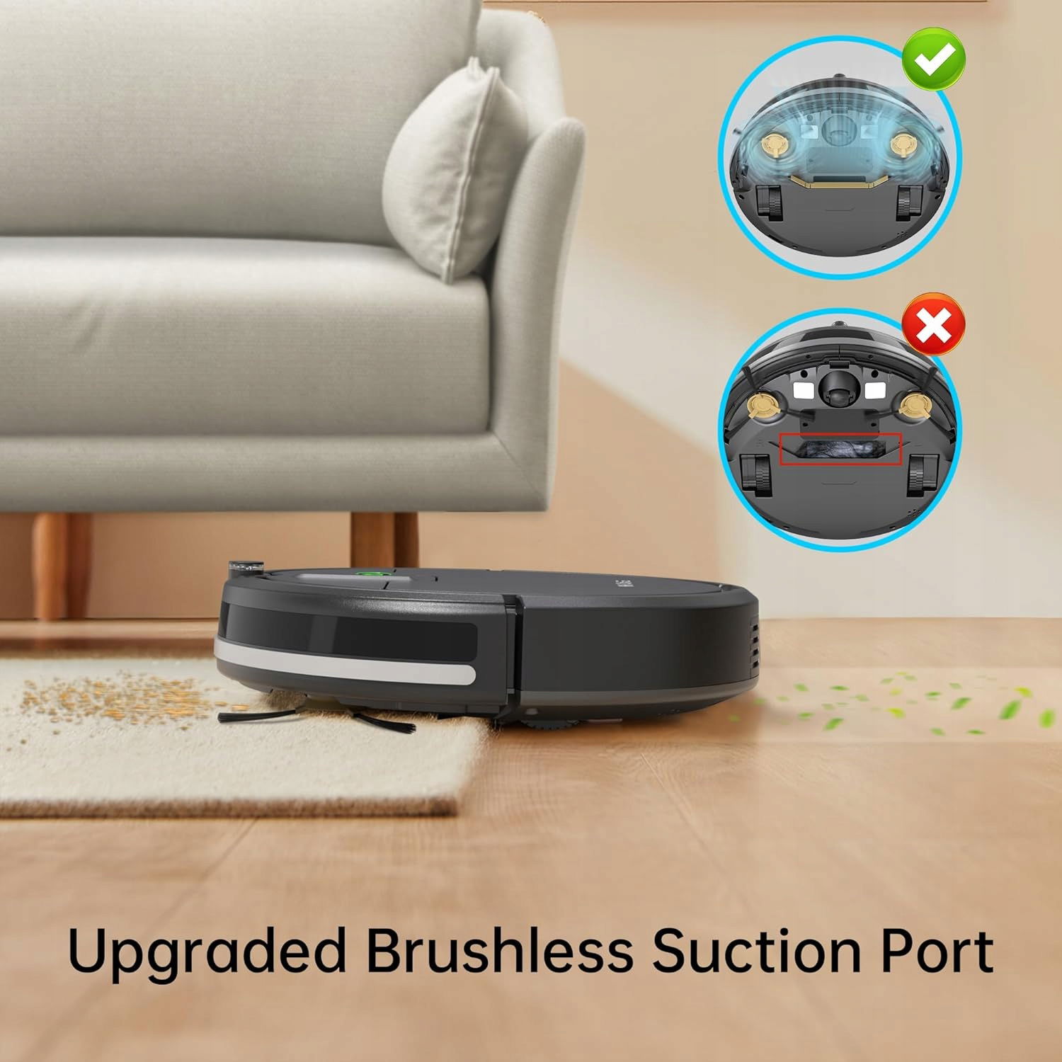 - Konstrukcja zapobiegająca splątaniu: ten robot odkurzacz jest wyposażony w unikalny bezszczotkowy port ssący, który zapewnia, że sierść zwierząt i inne zanieczyszczenia łatwo trafiają do kosza na śmieci. W przeciwieństwie do szczotek walcowych, ssanie nie plącze włosów, oszczędzając czas i wysiłek.