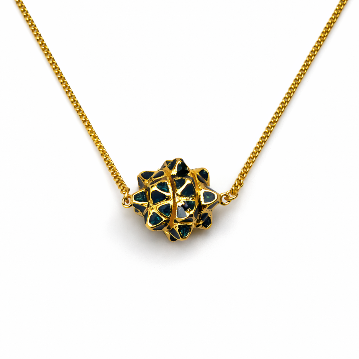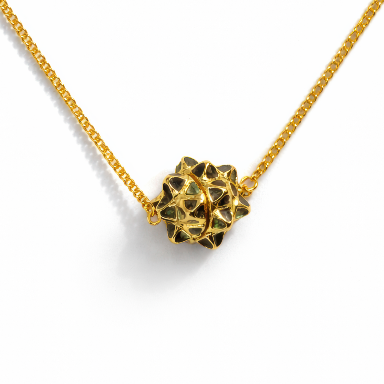 Od lśniących wież Piltover po neonowe zaułki Zaun, energia hextech w uniwersum League of Legends wygląda jakby za sekundę miała strzelić iskrą — i właśnie ten „naładowany” klimat łapie wisiorek Rock Love Arcane w formie małego talizmanu. Wykonany z metalu i wykończony na bogaty, złoty połysk, ma w środku zwartą, wielościenną „kulę” z błyszczącymi panelami w głębokiej zieleni i turkusie, a każdy fragment jest obramowany wypukłą, złotą siateczką jak ochronna klatka. Ciepły, złoty łańcuszek o ciasnym splocie pięknie to podkreśla, a ciemne wstawki mają szklistą głębię — jak zamknięta w środku magia. Z każdej strony łapie światło inaczej, więc całość wygląda dynamicznie i premium. Przy ok. 4 cm robi efekt „wow”, ale nie jest przytłaczający — świetny do warstwowych stylówek, cosplayu albo po prostu do czarnego t-shirta, kiedy chcesz przemycić trochę Arcane. Zawieszka jest wpięta w łańcuszek po bokach przez małe kółeczka, więc trzyma się centralnie i stabilnie podczas noszenia — na co dzień, do kolekcji albo na prezent dla fana. Geometryczny, hextechowy design przywołuje energiczne „rdzenie” znane z ekranu bez przesady w deklaracjach, dzięki czemu łatwo mieć kawałek Runeterry zawsze przy sobie.