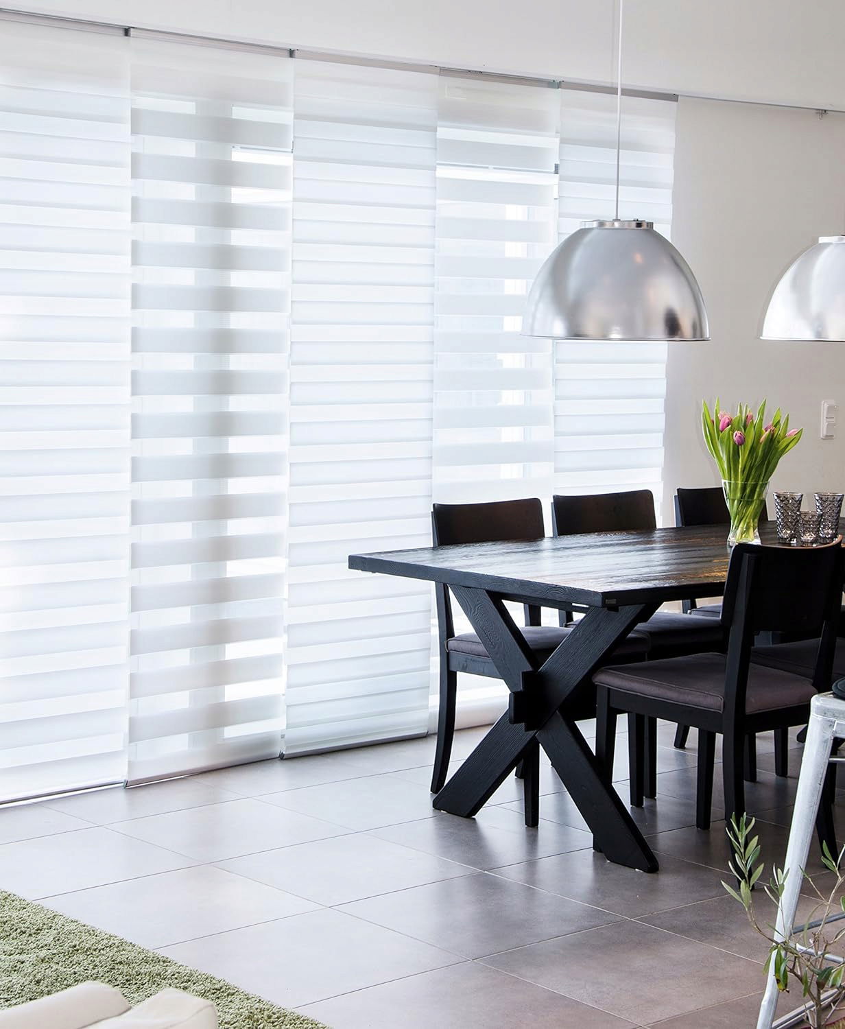 Łatwość obsługi: Bezpośrednie zawieszenie zasłony panelowej (przy użyciu profilu aluminiowego wraz ze ślizgaczem), Wygodne skracanie długości (2 wymienne wypustki samoprzylepne), Zmiana pasów tkaniny poprzez pociągnięcie
