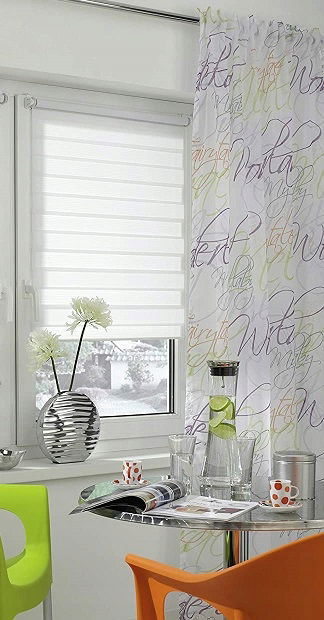 - Praktyczna roleta podwójna do wszystkich popularnych okien, Płynna regulacja za pomocą łańcuszka, Indywidualnie regulowane oświetlenie pomieszczenia dzięki naprzemiennym pasom przezroczystym (wysokość 5 cm) i nieprzezroczystym (wysokość 7,5 cm), Montaż bez wiercenia i narzędzi