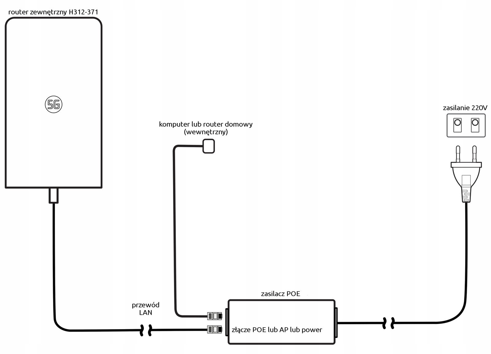 Huawei H312-371, to router zewnętrzny (tzw. ODU) na kartę SIM, który obsługuje pasma 5G oraz 4G LTE. Router ten jest jednocześnie anteną zewnętrzną tzn. wkładasz do niego kartę SIM, montujesz na zewnątrz i doprowadzasz jeden przewód, który jest jednocześnie przewodem zasilającym oraz sygnałowym. Zwróć uwagę na schemat podłączenia poniżej.