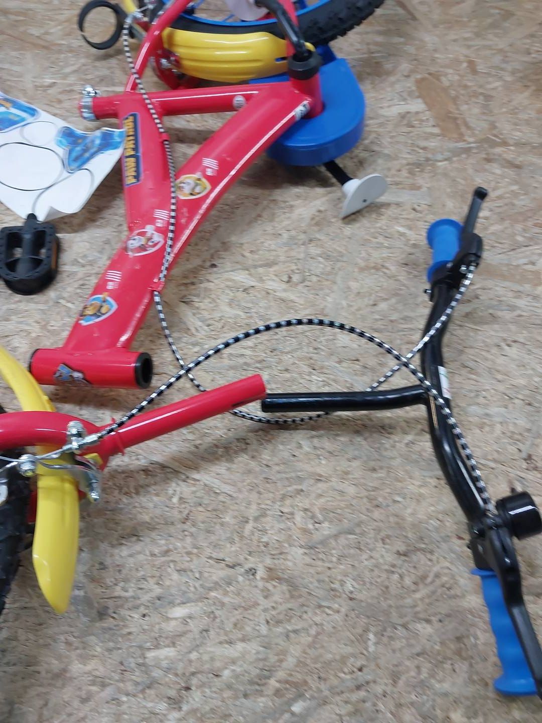 NOWY ROWEREK DZIECIĘCY – TECHNICZNIE SPRAWNY, ALE Z DROBNYMI WADAMI WIZUALNYMI: PORYSOWANA RAMA, USZKODZONA OSŁONA KIEROWNICY I NAKLEJKA Z INNEGO MODELU