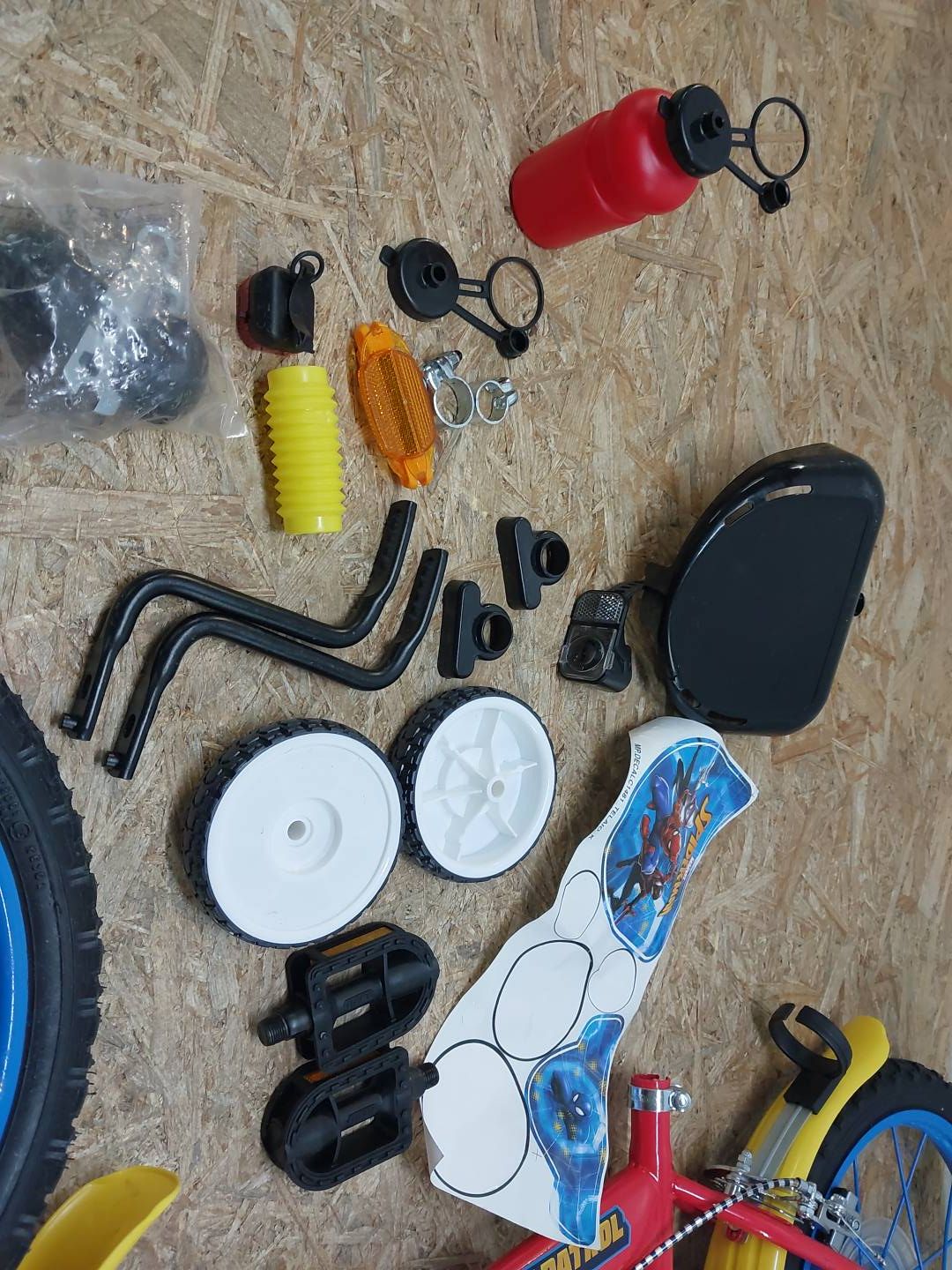 Rozmiar kół: 16 caliMateriał ramy: stalUkład kierowniczy i korbowy: nylonRodzaj hamulców: szczękowe, przód i tyłTyp napędu: jednobiegowy, wolnobiegKółka boczne: w zestawie, beznarzędziowy montażDodatki: bidon w kolorze czerwonym, koszyk, osłona łańcucha, błotniki, dzwonek, oświetlenie, odblaskiWzrost dziecka: 105–120 cm
