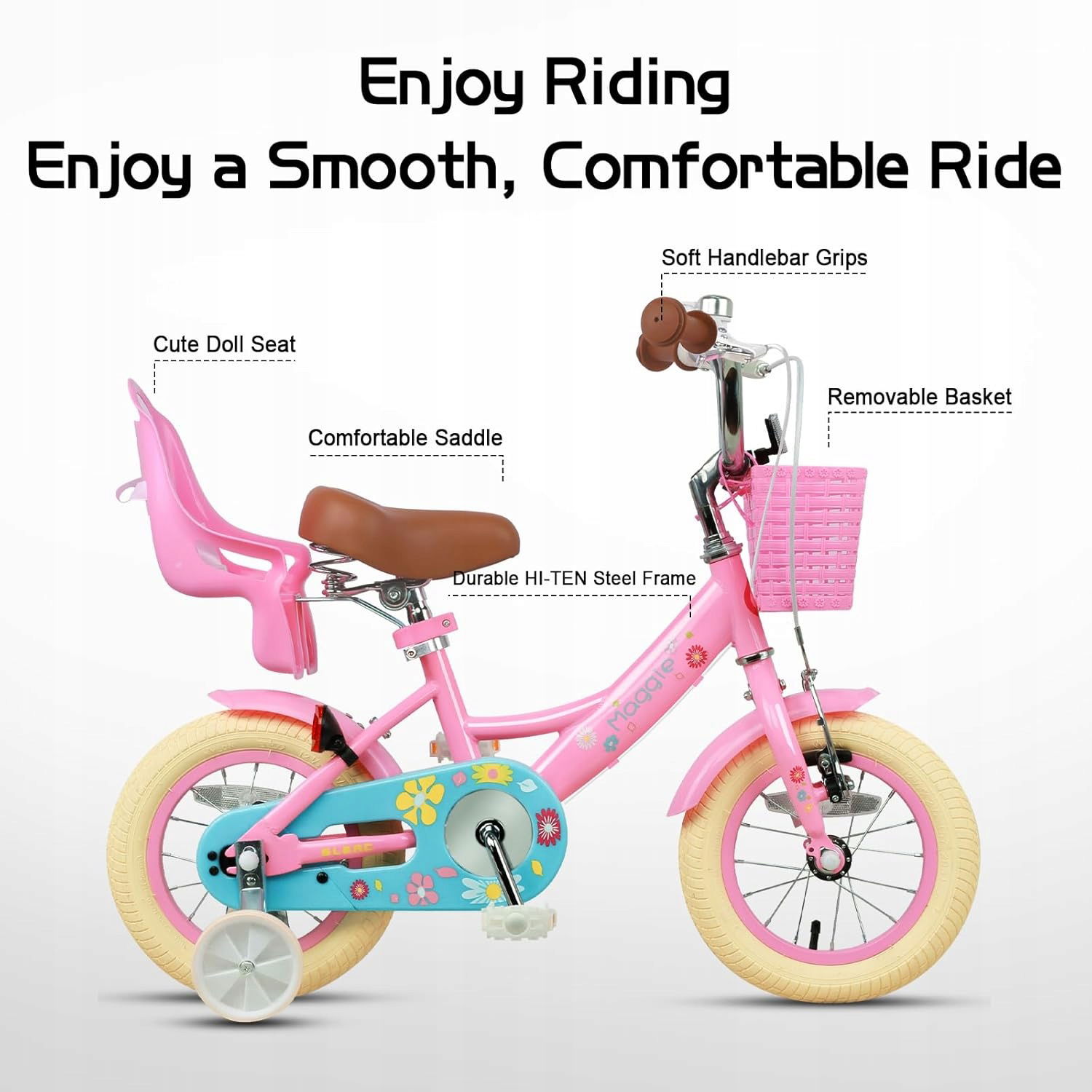 Glerc Maggie 12 cali, rower dziecięcy dla dziewczynek w wieku 2-6 lat, z siedziskiem dla lalek i kółkami podporowymi,