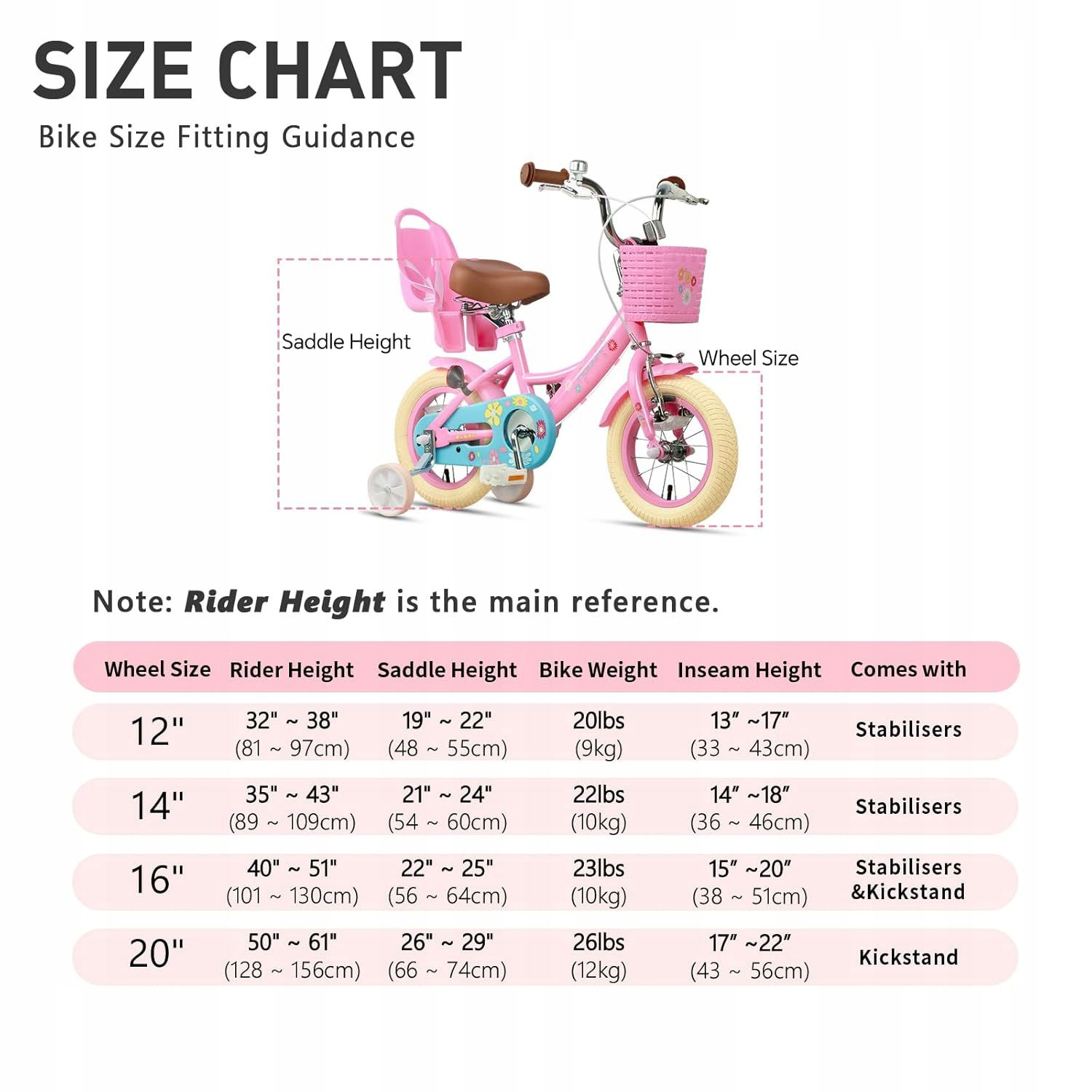 - 【Proszę sprawdzić rozmiar】 – Rower o przekątnej 12" jest przeznaczony dla dzieci w wieku od 1 do 4 lat lub 80-91 cm. Rower 14" jest przeznaczony dla dzieci w wieku od 3 do 5 lat lub 89-109 cm. Rower 16" jest przeznaczony dla dzieci w wieku 4 – 7 lat lub 102-130 cm.