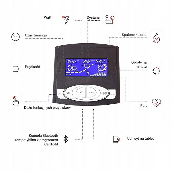 - Podczas treningu dwukolorowy podświetlany wyświetlacz LCD pokazuje liczne dane dotyczące wydajności, takie jak czas, dystans, częstotliwość pedałowania, wartość wytworzonej energii mechanicznej (wat), prędkość, kalorie spalone podczas treningu i tętno.