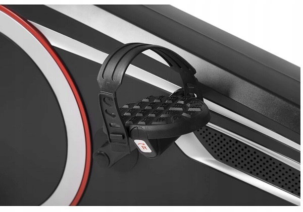 - Antypoślizgowe pedały z regulowanymi paskami bezpieczeństwa zapewniają bezpieczny trening.